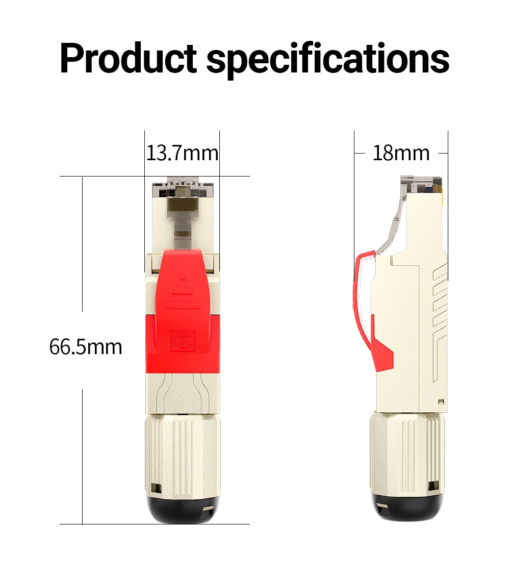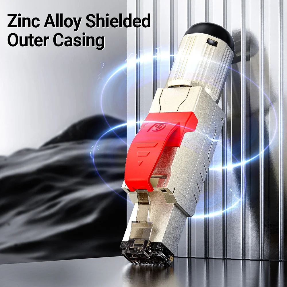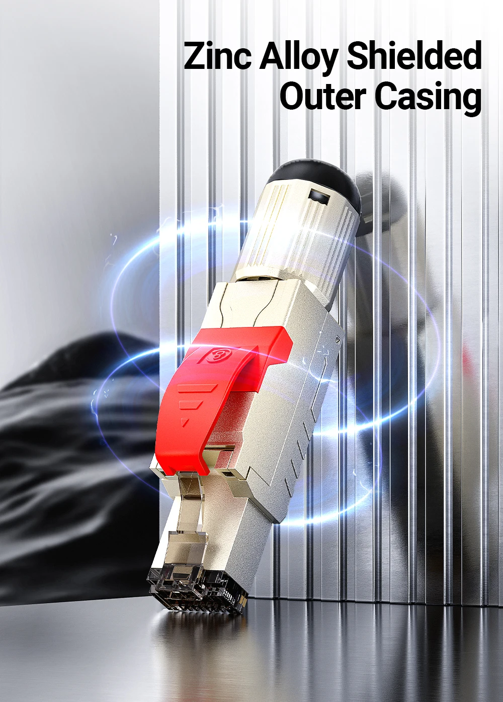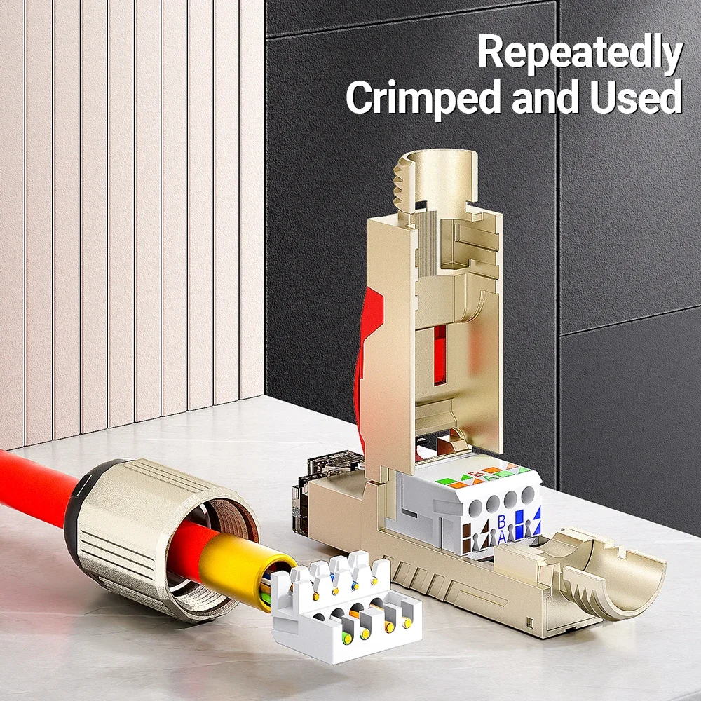 Descripción del producto1. FULL METAL JACKET Enchufe de campo RJ45 para conexiones de servidor y conmutador de red de canal Cat 8; Los enchufes modulares con carcasa robusta fundida a presión proporcionan un blindaje superior y mitigan la diafonía alienígena en un cable Ethernet Cat 8; admite cable Cat8 AWG blindado de 22 a 24 AWG con un diámetro exterior entre 7,0 y 8,5mm; Compatible con versiones anteriores como conector Cat 6A o Cat 72. RENDIMIENTO CAT8 para una red compatible con canales 10GBASE-T, 25GBASE-T o incluso 40GBASE-T hasta 30 metros; Rendimiento verificado del canal GHMT Cat 8; Totalmente compatible con Cat 6 (Cat6), redes Ethernet Cat 6A (Cat6A), Cat 7 (Cat7A)3. CONECTOR RJ45 SIN HERRAMIENTAS DE IMPACTO con un diseño con bisagras abiertas que simplifica la colocación y terminación del cable blindado voluminoso; Los módulos IDC se pueden cablear para cableado T568A o T568B con una tapa de terminación codificada por colores4. SUPERIOR CONSTRUCTION combina una carcasa metálica de una pieza con un cilindro silenciador integrado para suprimir el ruido electromagnético y La diafonía EMI, NEXT y AXT; una bota de alivio de tensión de metal atornillable protege la integridad del cable y aumenta el rendimiento de la protección; una cubierta antipolvo con clasificación IP20 protege los contactos RJ45 al transportar o almacenar un cable terminado5. Compatible con PoE PLUS para aplicaciones IEEE 802.3at Power over Ethernet (PoE +); termine un cable Ethernet Cat8 con soporte para negociación automática Cat 8 en una red mixta con velocidades de transferencia de datos variables a un conmutador de 1 GB, conmutador de 10 GB o conmutador de 40 GB6. El conector CAT8 admite Cable de 22-24AWG, el conector CAT7 y CAT6A admite Cable de 23-26AWGEnchufe industrial de alta calidadConector STP RJ45 de aleación de zinc (versión más alta AMPCOM)