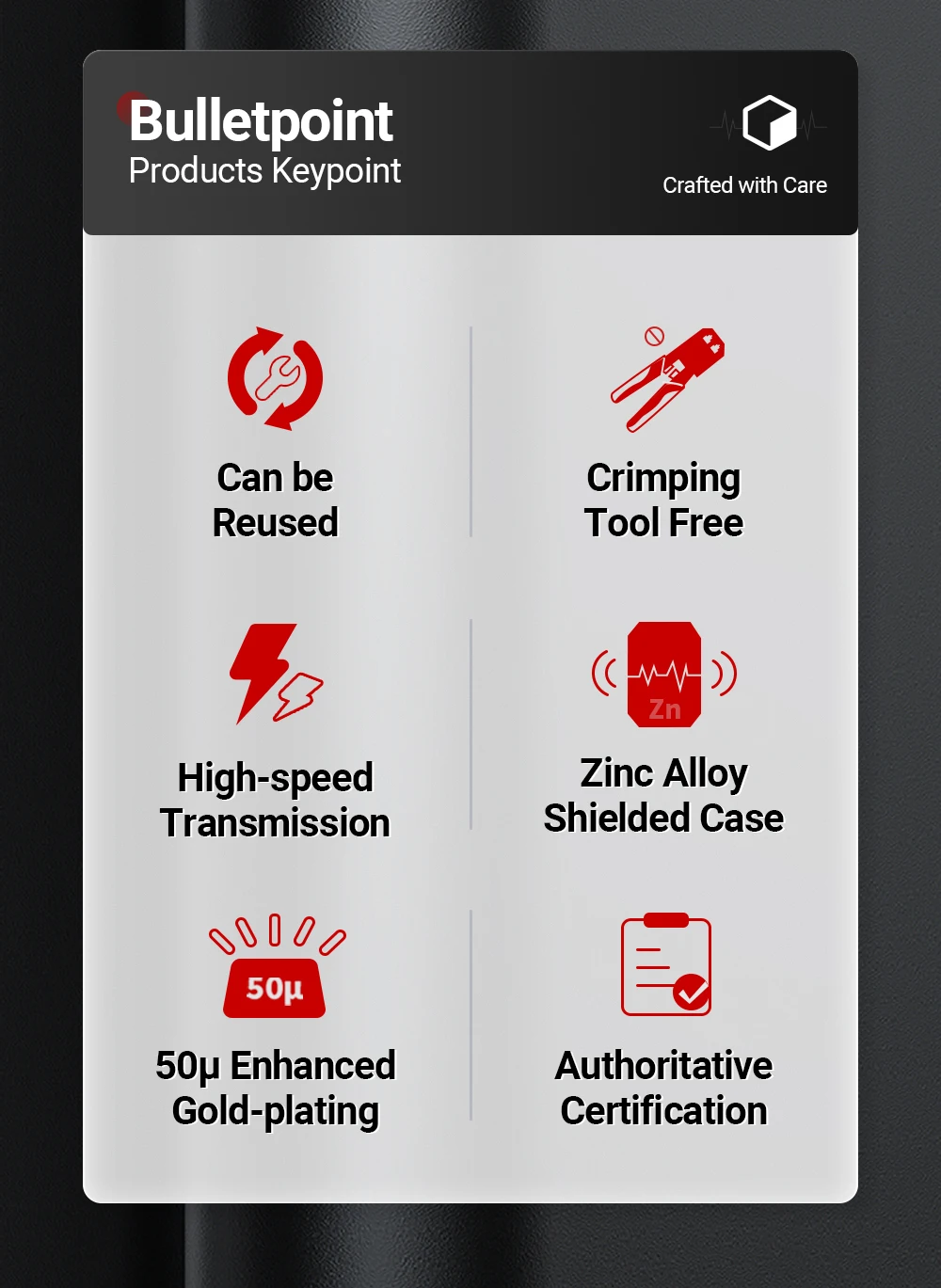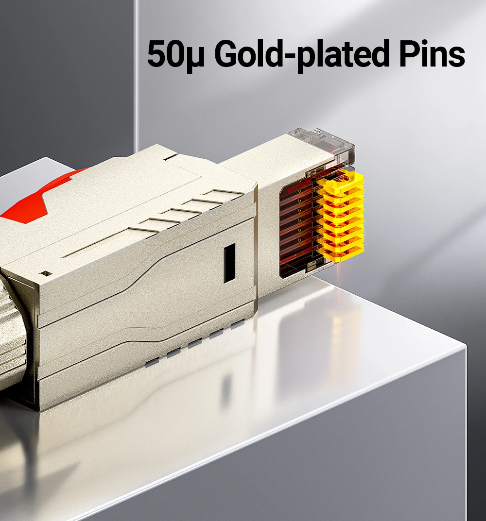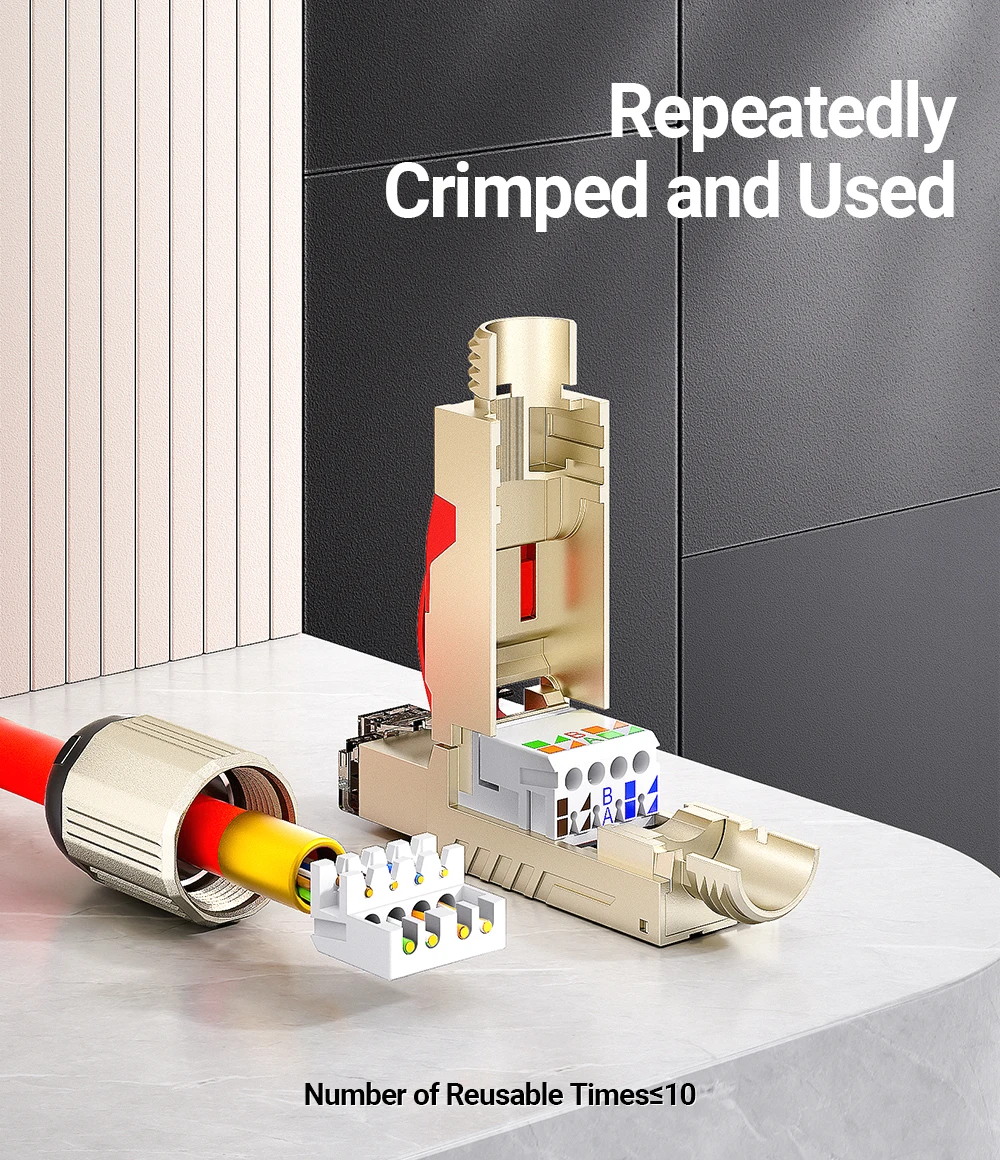 Descripción del producto1. FULL METAL JACKET Enchufe de campo RJ45 para conexiones de servidor y conmutador de red de canal Cat 8; Los enchufes modulares con carcasa robusta fundida a presión proporcionan un blindaje superior y mitigan la diafonía alienígena en un cable Ethernet Cat 8; admite cable Cat8 AWG blindado de 22 a 24 AWG con un diámetro exterior entre 7,0 y 8,5mm; Compatible con versiones anteriores como conector Cat 6A o Cat 72. RENDIMIENTO CAT8 para una red compatible con canales 10GBASE-T, 25GBASE-T o incluso 40GBASE-T hasta 30 metros; Rendimiento verificado del canal GHMT Cat 8; Totalmente compatible con Cat 6 (Cat6), redes Ethernet Cat 6A (Cat6A), Cat 7 (Cat7A)3. CONECTOR RJ45 SIN HERRAMIENTAS DE IMPACTO con un diseño con bisagras abiertas que simplifica la colocación y terminación del cable blindado voluminoso; Los módulos IDC se pueden cablear para cableado T568A o T568B con una tapa de terminación codificada por colores4. SUPERIOR CONSTRUCTION combina una carcasa metálica de una pieza con un cilindro silenciador integrado para suprimir el ruido electromagnético y La diafonía EMI, NEXT y AXT; una bota de alivio de tensión de metal atornillable protege la integridad del cable y aumenta el rendimiento de la protección; una cubierta antipolvo con clasificación IP20 protege los contactos RJ45 al transportar o almacenar un cable terminado5. Compatible con PoE PLUS para aplicaciones IEEE 802.3at Power over Ethernet (PoE +); termine un cable Ethernet Cat8 con soporte para negociación automática Cat 8 en una red mixta con velocidades de transferencia de datos variables a un conmutador de 1 GB, conmutador de 10 GB o conmutador de 40 GB6. El conector CAT8 admite Cable de 22-24AWG, el conector CAT7 y CAT6A admite Cable de 23-26AWGEnchufe industrial de alta calidadConector STP RJ45 de aleación de zinc (versión más alta AMPCOM)