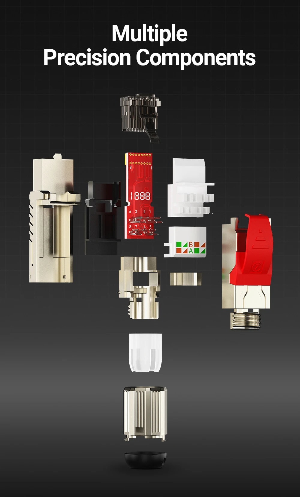 Bota ajustable tipo tuerca bloqueadaTiene un pestillo ajustable internamente (excluyendo los conectores CAT8) que se puede apretar o aflojar con un enchufe trasero para asegurar el cable, adecuado para varios diámetros exteriores (OD) de cable.