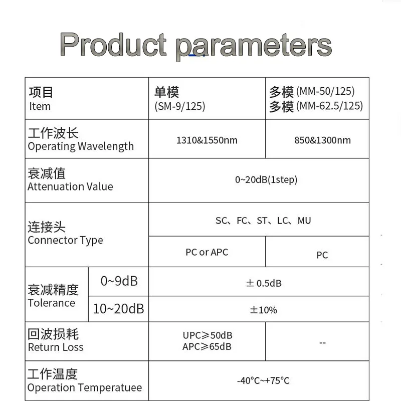 Este atenuador de fibra óptica tiene valores de atenuación de 1, 2, 3, 4, 5, 6, 7, 8, 9, 10 ~ 20dB (¡tenga en cuenta al realizar el pedido!)