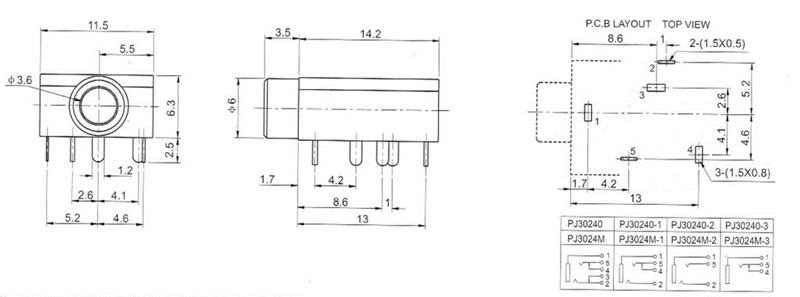Conector de Audio hembra 100 de 3,5mm 1/8, conector de auriculares estéreo DIP de 5 pines PJ324M