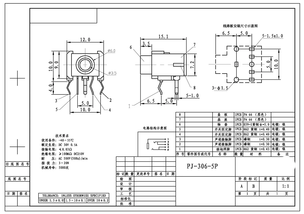 Conector de Audio hembra PJ306 piezas, Conector de auriculares estéreo DIP de 5 pines, 3,5mm, 10 PJ-306