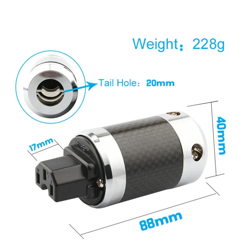 3.Modelo: conector de enchufe de alimentación de CA HiFi4.Material de la carcasa: fibra de carbono5.Material del cuerpo: aleación de metal.6.Versión: UE7.Conexión a tierra: Estándar8.Proceso de revestimiento: rodio9.Tipo: enchufe eléctrico10.Versión UE Tensión nominal: 250 V11.Corriente nominal: 16A12.Aplicación: Audio y vídeo