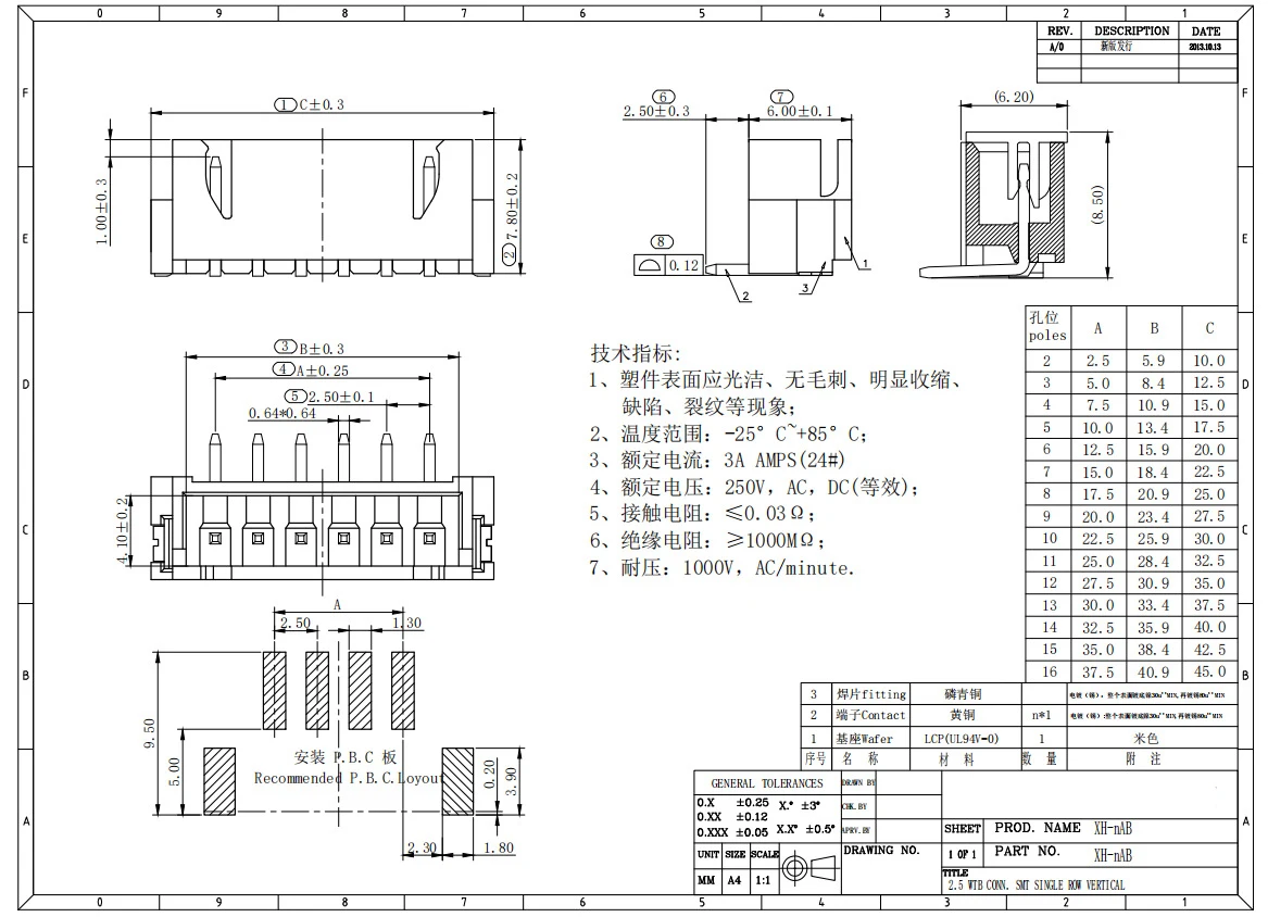 Conector de barra de resistencia de alta temperatura, piezas, parche Vertical 2P-10P, oblea SMT, 50 XH-2.54-LT