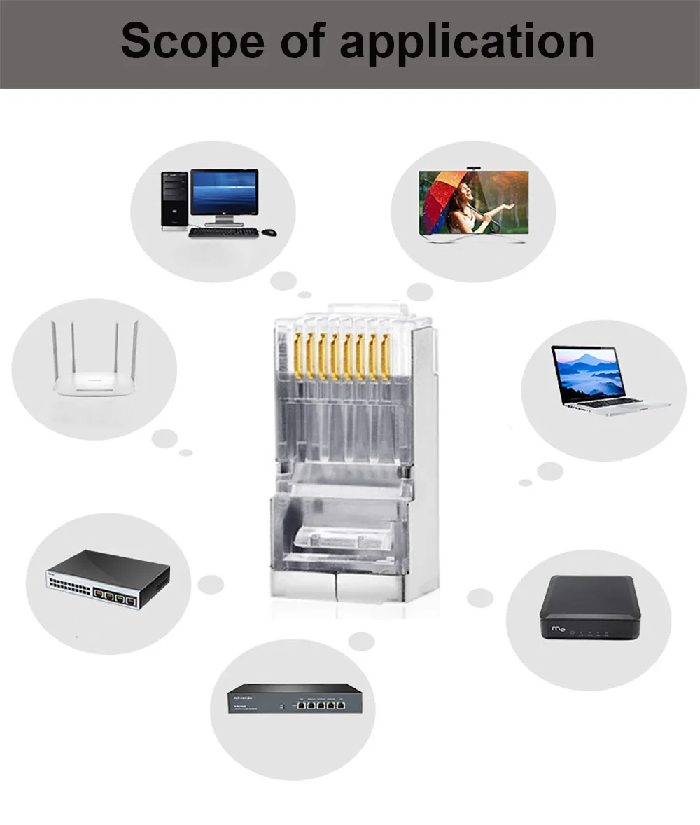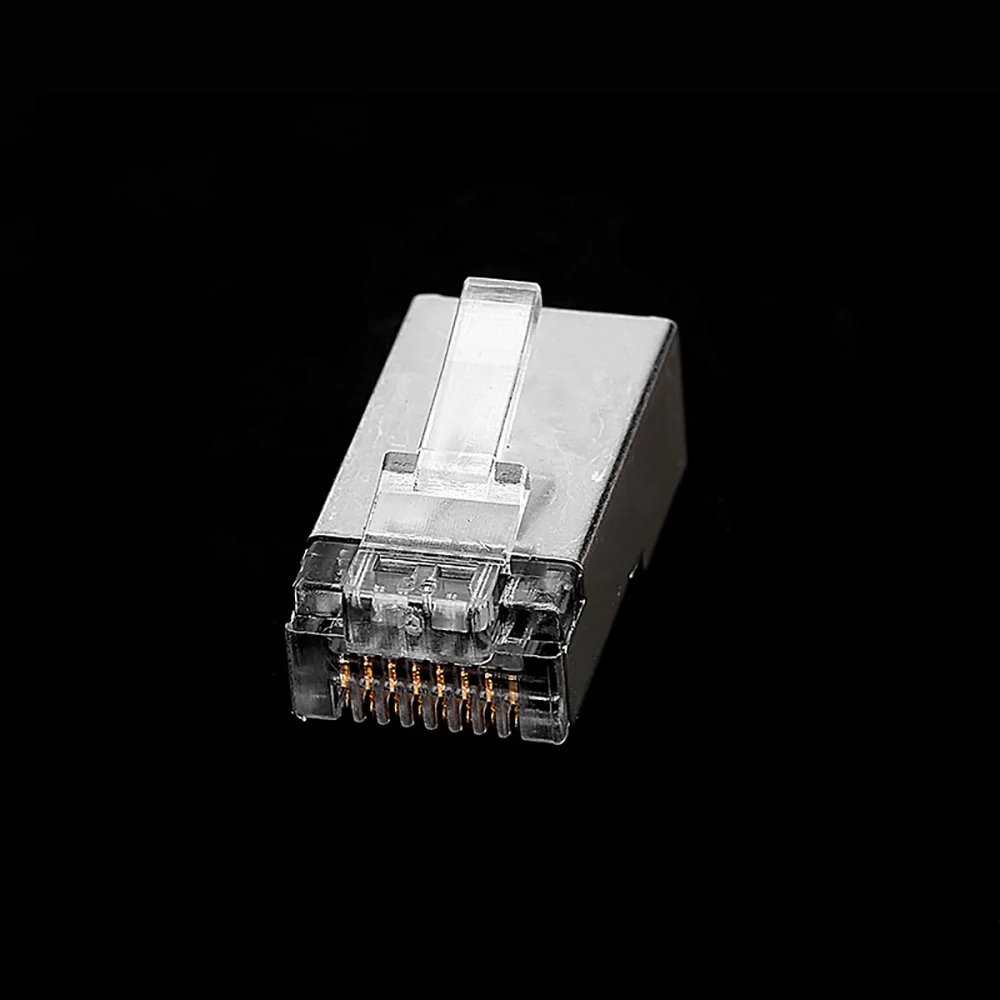 100 nuevo y de alta calidad.Conectores RJ45 blindados Enchufe modular.Enchufes de cable de red de 8 pines.Cables chapados en oro para una mejor transmisión de datos y una mayor intensidad de la señal.