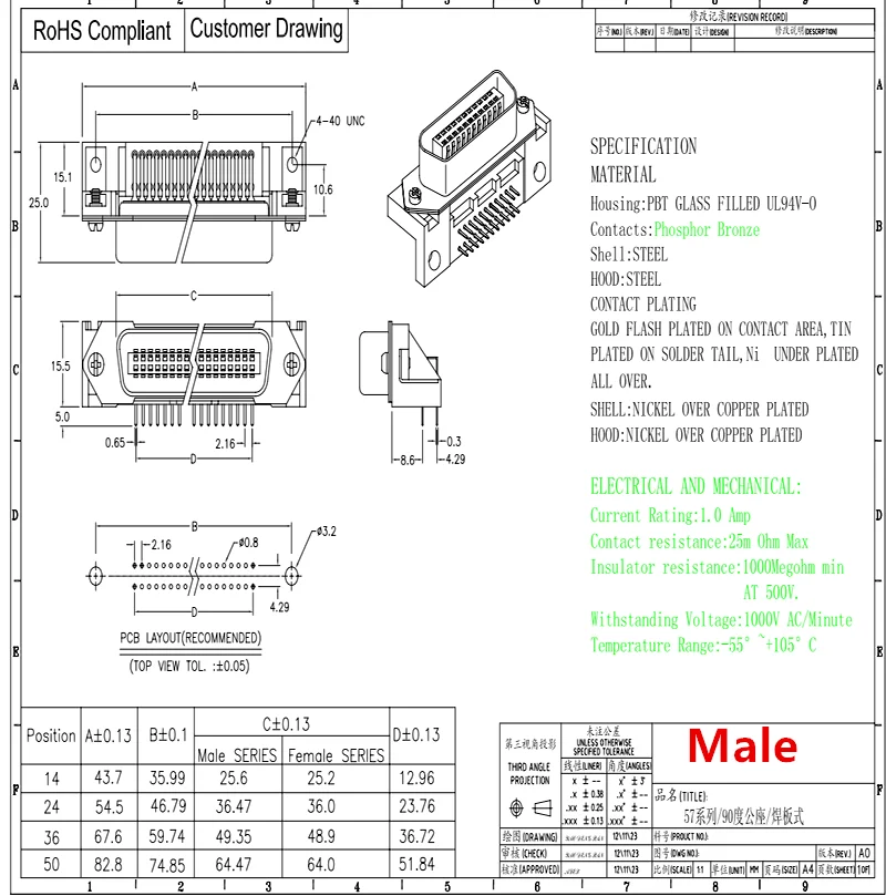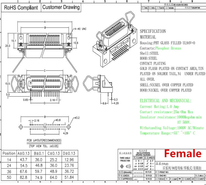 Comprar Conector centrónico macho y hembra, conector de Impresora Tipo DIP, montaje PCB de 90 grados, serie 57, 14, 24, 36 y 50 pines