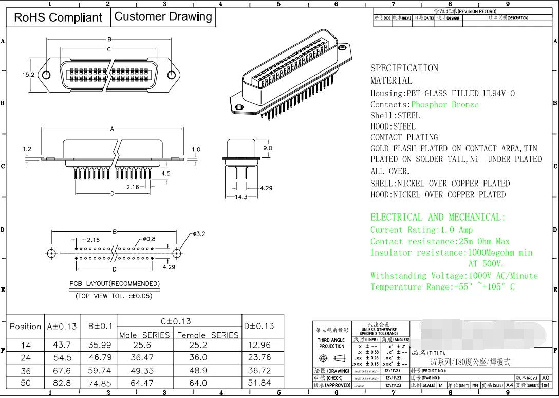 Comprar Conector centrónico serie 57, 1 piezas, macho/hembra, CN-14P24P36P/50P, 180 grados, Conector de pin recto con puerto de impresora lineal