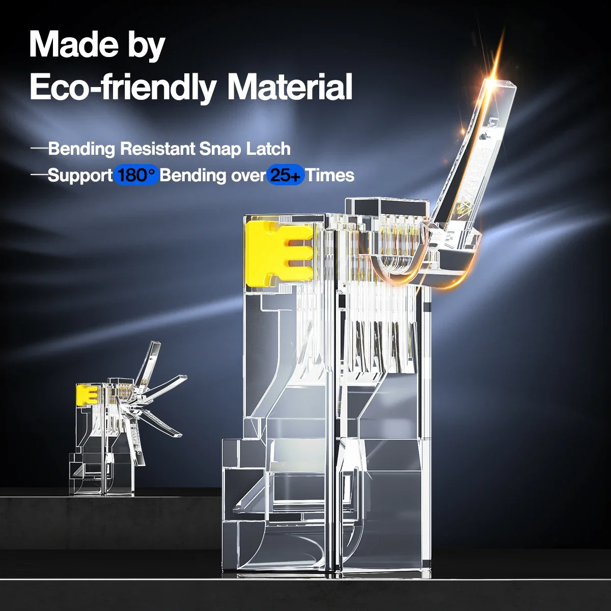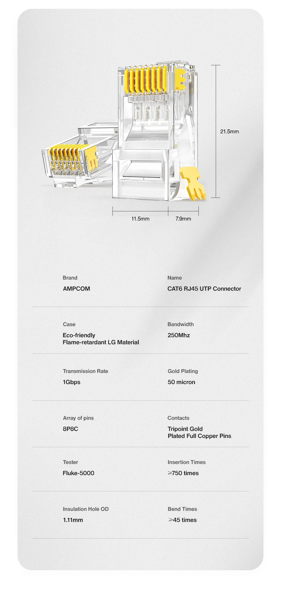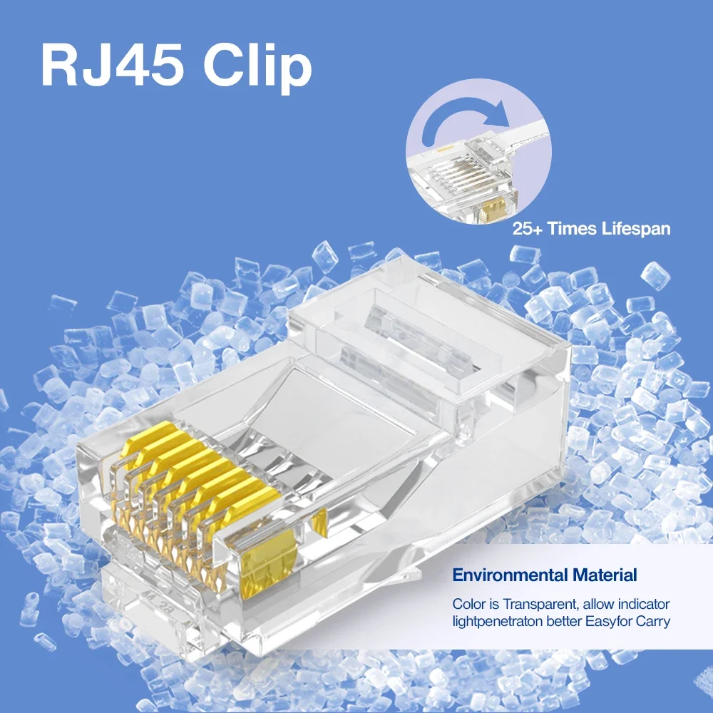 •Uso sin preocupaciones: los contactos chapados en oro de 50u mantienen una transmisión de datos superior y confiable al evitar que la corrosión dure con el tiempo; La carcasa de policarbonato transparente resistente a los impactos es duradera para el engarzado.El clip de bloqueo del conector se puede doblar muchas veces sin romperse.