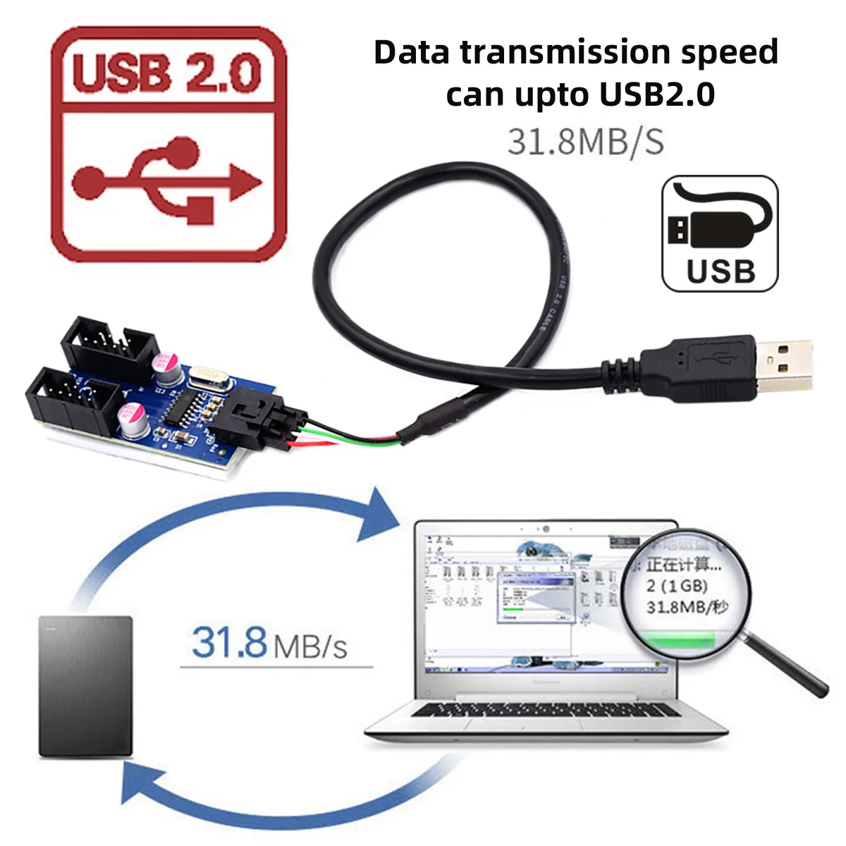 Placa base 9pin Header HUB Conector USB 2,0 Tipo-A Adaptador de extensión Puerto Multilier 1 Macho a 2 Hembra
