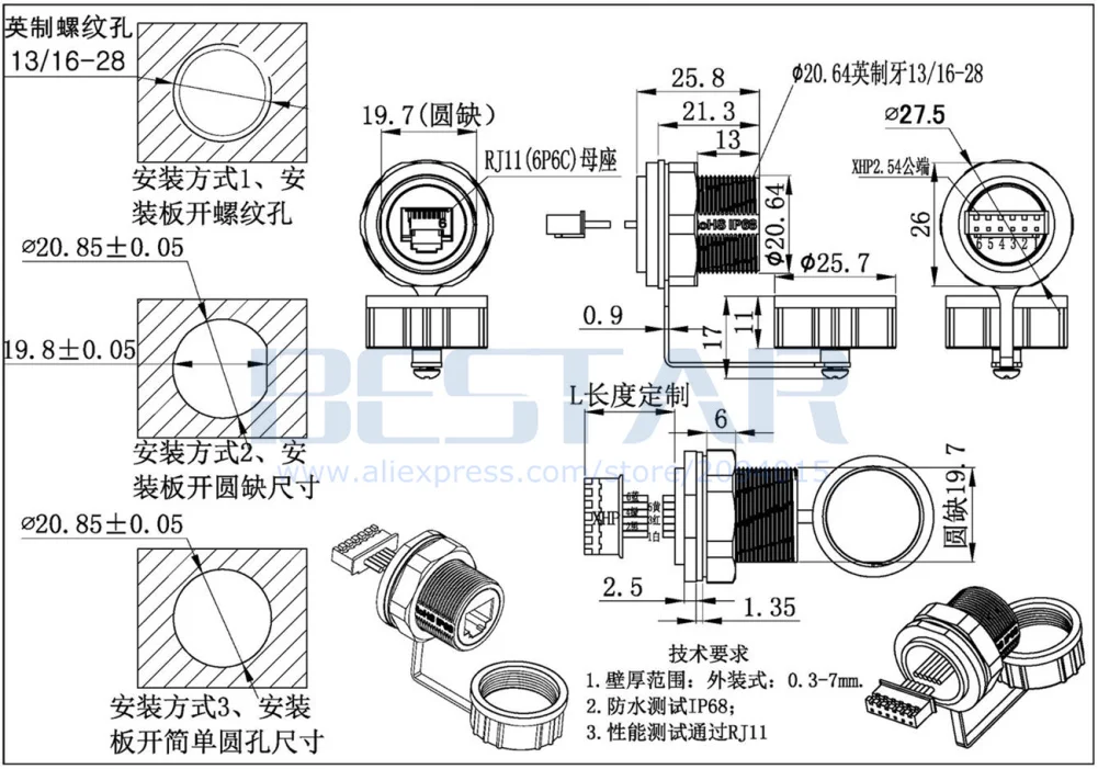 Conector de enchufe impermeable RJ11 M20 XHP 2.54 RJ 11 6P6C Cable de extensión de línea telefónica Extensor de adaptador universal de 4 núcleos y 6 núcleos
