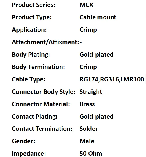 | Descripción del producto: Nuevo ![]() Crimpado de conector macho RF MCX para RG316,RG174,LMR100 chapado en oro recto |