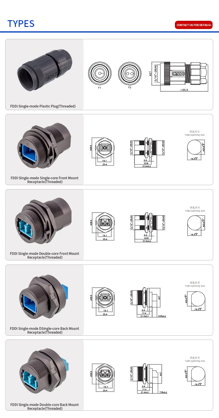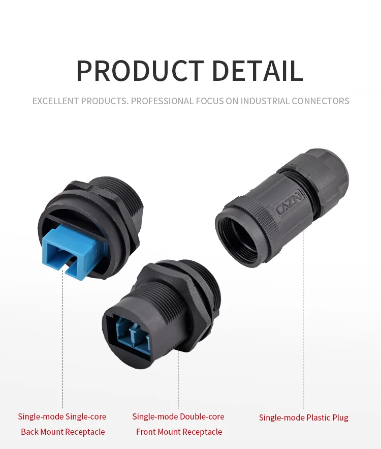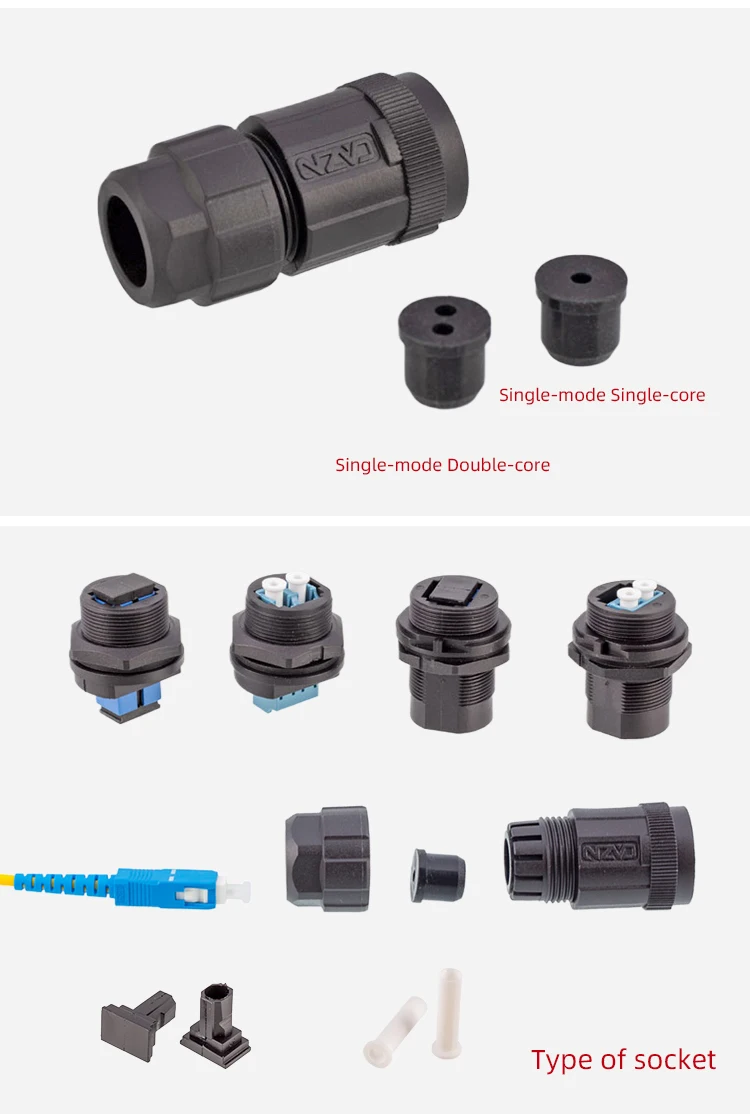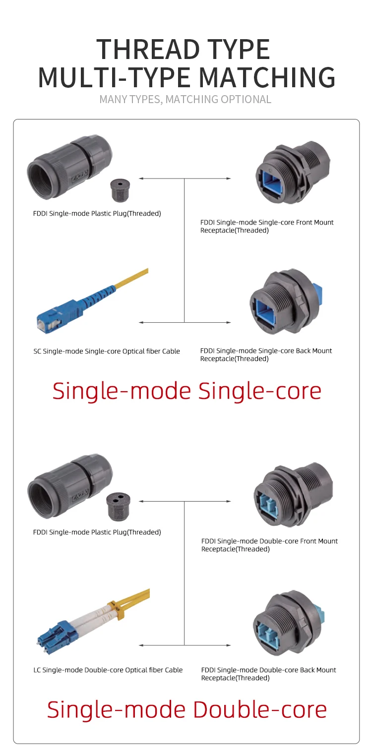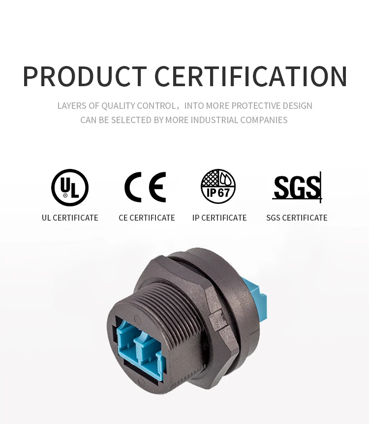 Conector impermeable E13 FDDI LC, enchufe monomodo roscado, receptáculo montado en la parte posterior/delantera con tapa antipolvoGrado impermeable: IP67/IP68