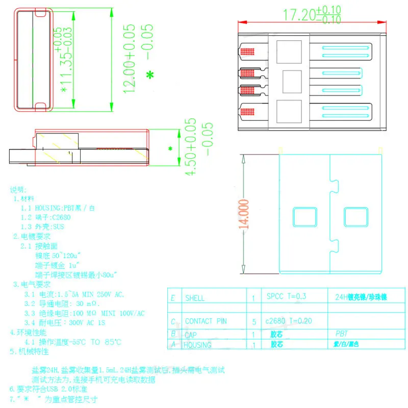 Conector de enchufe de alta corriente tipo cable macho USB A 2,0 4P tipo de cable de cuerpo corto 5A carga rápida y carga flash