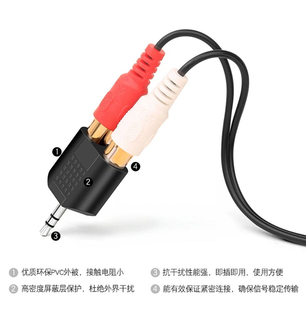 Conector estéreo de 3,5 mm a 2 adaptadores/convertidores RCA hembra.