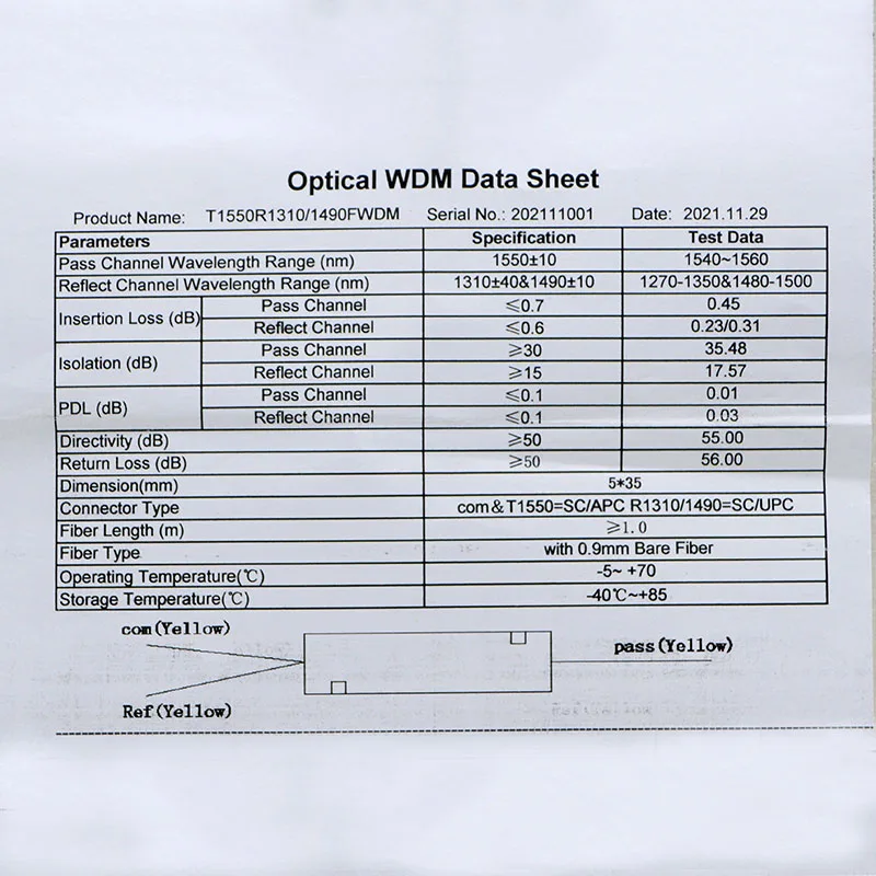 Con el fin de garantizar una alta calidad, estabilidad y fiabilidad, el tipo de filtro WDM selecciona el filtro de película con un excelente rendimiento. El tipo de filtro WDM puede realizar la combinación y división de señales ópticas de dos ventanas de comunicación, duplicar la capacidad de transmisión de una sola fibra óptica y realizar una comunicación de fibra bidireccional. Es ampliamente utilizado en la actualización de fibra óptica, la expansión o introducción de nuevos servicios integrales, como radio y televisión, telecomunicaciones, Internet, etc.