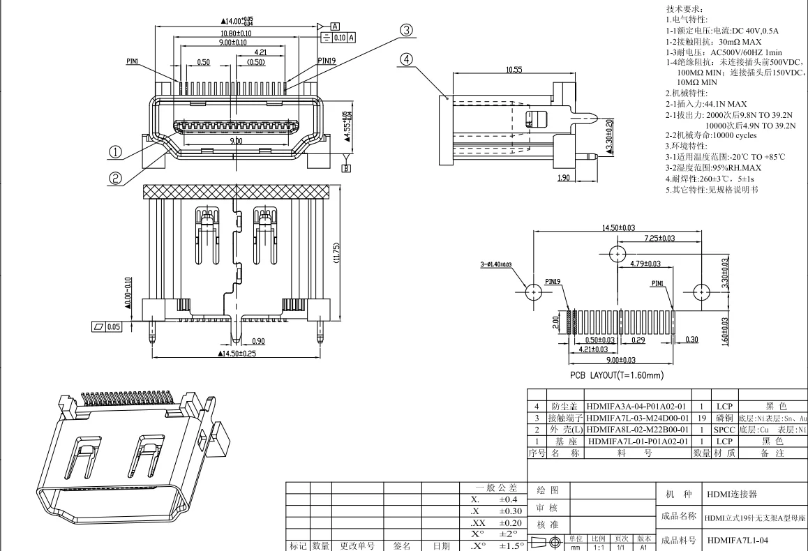 Comprar Conector hembra HDMI de 19 pines, conector Vertical SMT SMD, 180 grados, hd, 19 pines, 5 unidades
