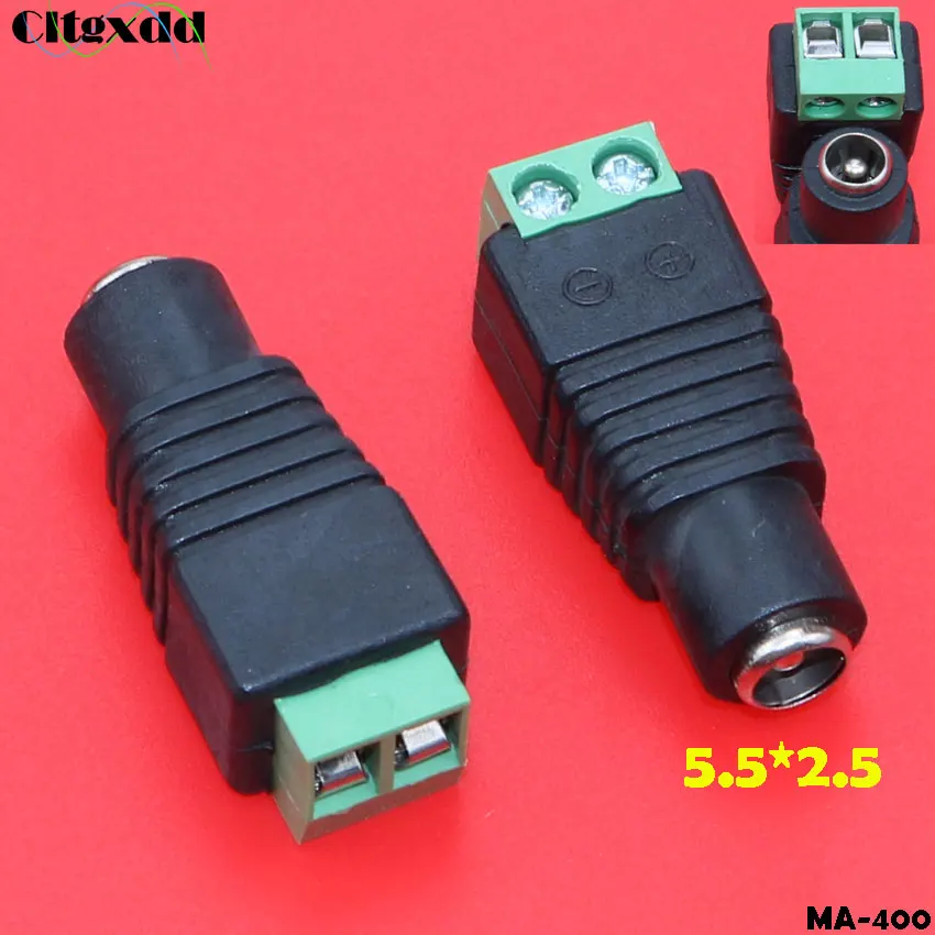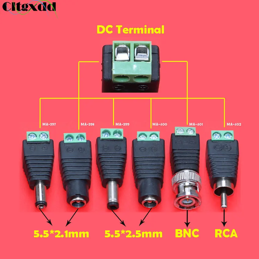 Conector hembra macho de alimentación de CC, adaptador de enchufe de bloque de terminales de crimpado BNC RCA a DC para cable de cámara CCTV, 5,5x2,1/5,5x2,5, 1 ud.