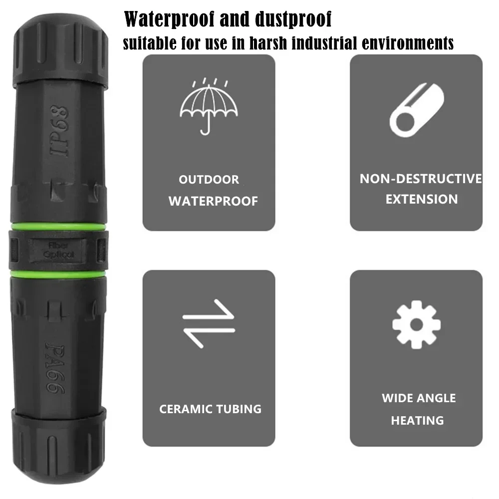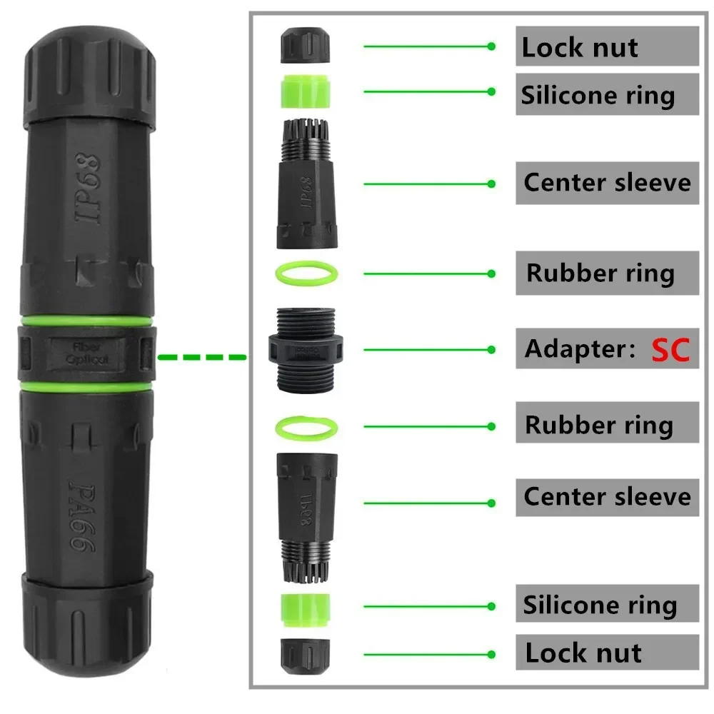 El producto es fácil de usar y no requiere herramientas ni conocimientos profesionales durante la instalación.Es plug and play, conveniente y rápido.Simplemente inserte el cabezal SC estándar para instalarlo rápidamente y lograr una conexión/desconexión rápida.El nivel de protección IP68 es una opción ideal para aplicaciones ambientales adversas.La carcasa del producto está hecha de nailon PA66 y el conducto cerámico de alto rendimiento es seguro y confiable.Está sellado con anillos de silicona y caucho y tiene un buen rendimiento a prueba de agua, una gran capacidad a prueba de agua y no tiene atenuación de señal.Es ampliamente utilizado en lugares donde se requiere la transmisión de señales de fibra óptica.Está diseñado para cuadros de distribución de fibra óptica (ODF), redes de comunicación de fibra óptica, Fast Ethernet, canales de fibra, velocidad Gigabit Ethernet, redes de área local, centros de datos, instalaciones internas, redes de área amplia, aplicaciones comerciales, etc.