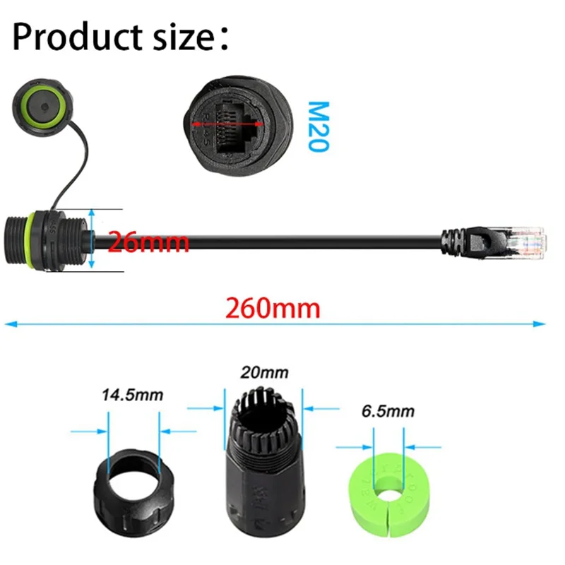 1: Conector: RJ45, Número de pines: 8, Material: Carcasa hecha de nailon PA66 (UL94V-0), Pasador de contacto del zócalo hecho de alambre de cobre fósforo de 0,5 mm de diámetro, Grosor del revestimiento de oro del pasador de contacto: 6 pulgadas, Anillo de goma impermeable: silicona