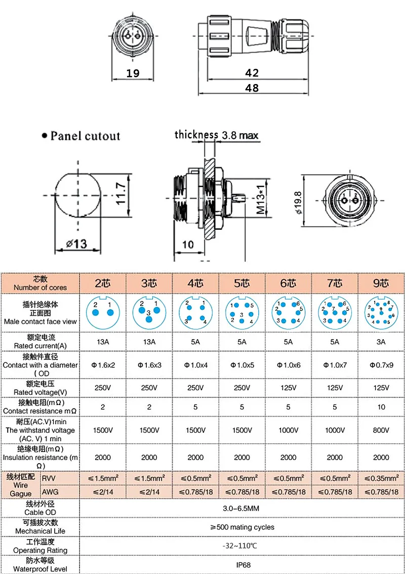 Parámetro de especificaciónMaterial de la carcasa: termoplástico PA66Aislante: termoplástico PPS resistente a altas temperaturas 260Material de contacto: cobre (chapado en oro, plateado)Anillo de sellado: gel de síliceGénero de la carcasa: asiento femenino masculinoConexión: conexión de roscaTemperatura de funcionamiento: -35 grados C ~ 110 grados CHumedad relativa: 90%~95% (40 + 2 grados C)Sellado: en línea con IP68Diámetro de alambre aplicable: diámetro 3,0 ~ 6,5 mmVida mecánica: más de 500 veces