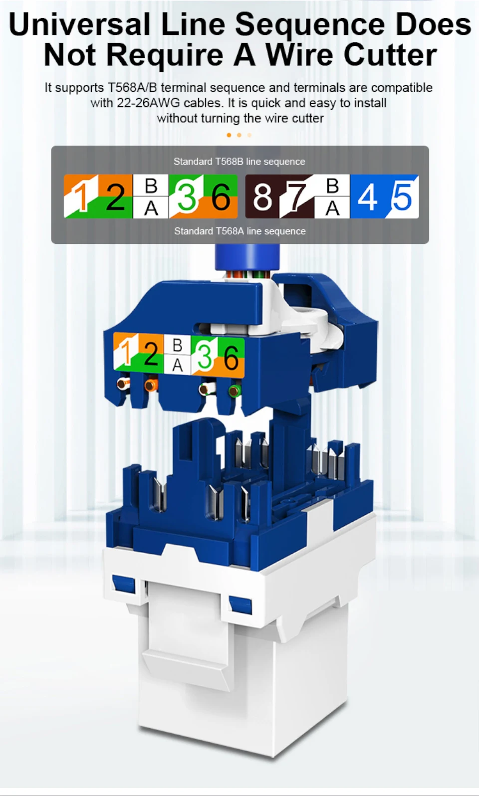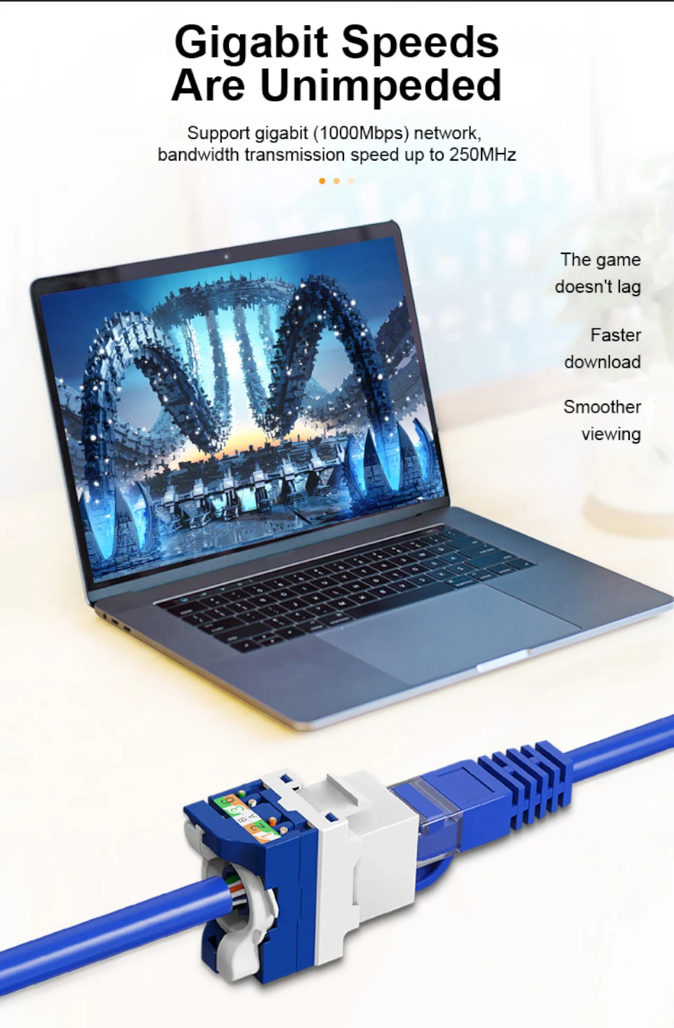 4. Cable IDC adecuado para cables de red sólidos y trenzados de 23 a 26AWG; contactos de enchufe de placa de níquel con chapado en oro de 50u "para una transmisión de datos de red confiable y rápida de baja pérdida.