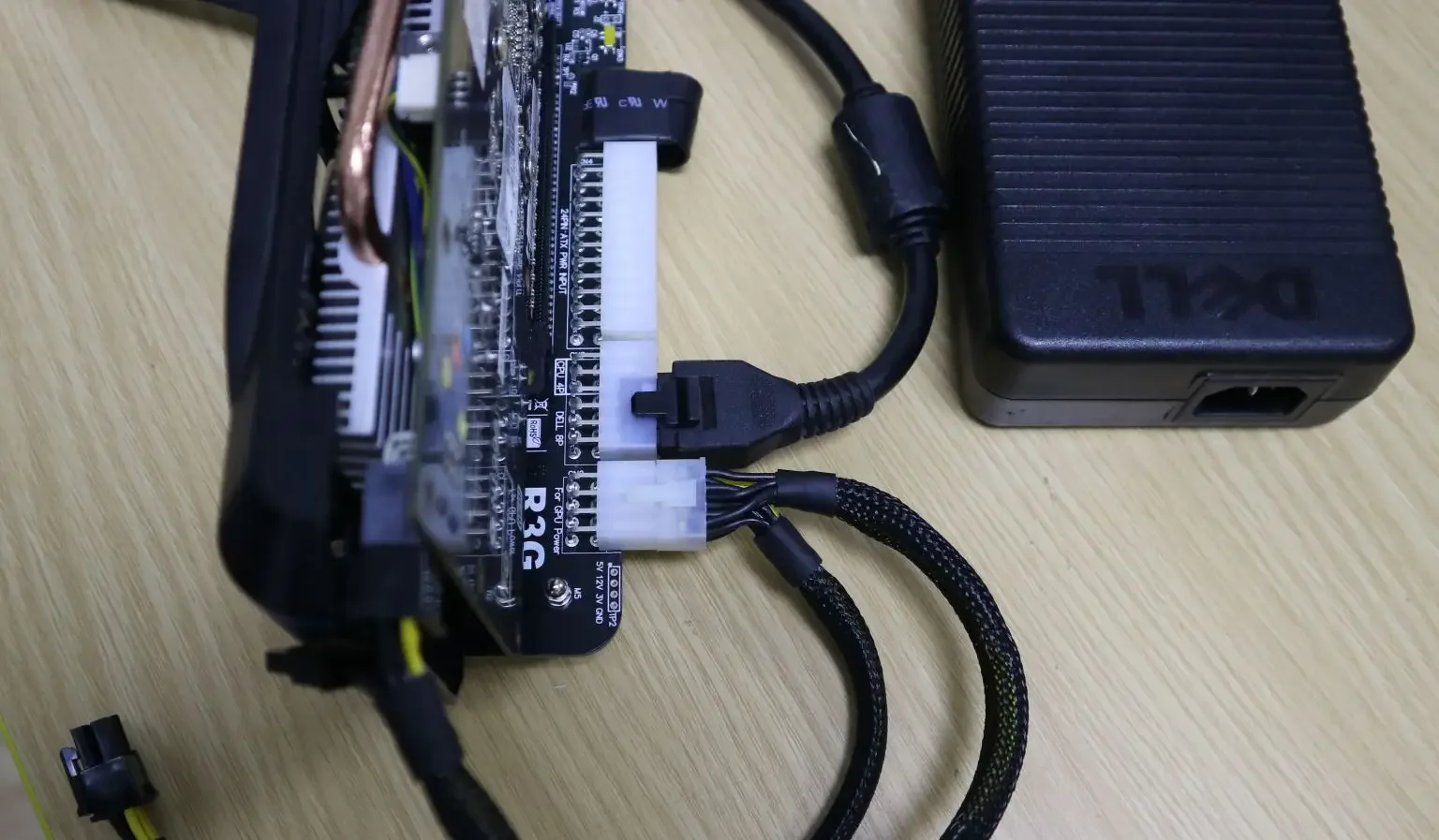 2. Instale la fuente de alimentación ATX o la fuente de alimentación DELL, incluido el cable de alimentación de la tarjeta gráfica también debe estar conectado, después de la instalación, la fuente de alimentación DELL se encenderá con luces naranjas.