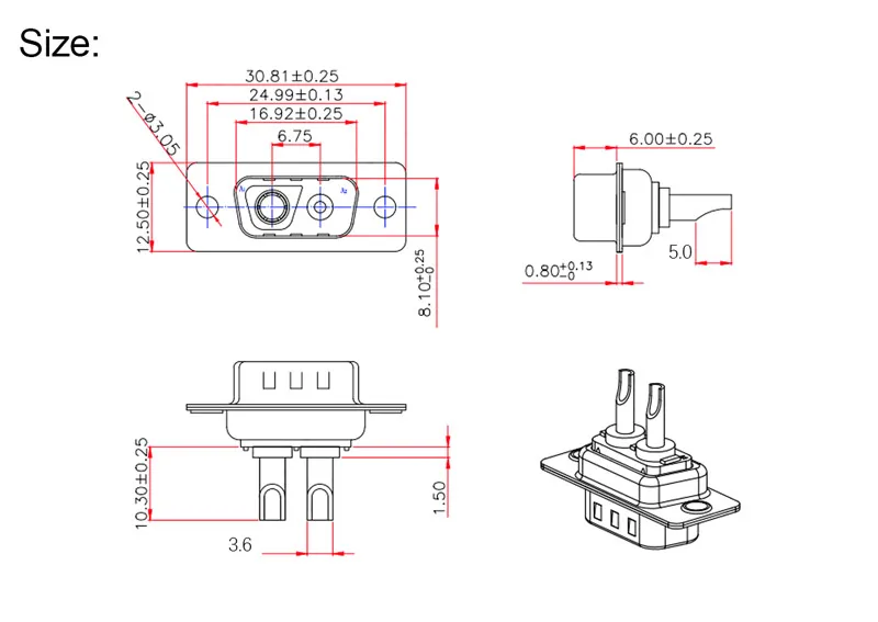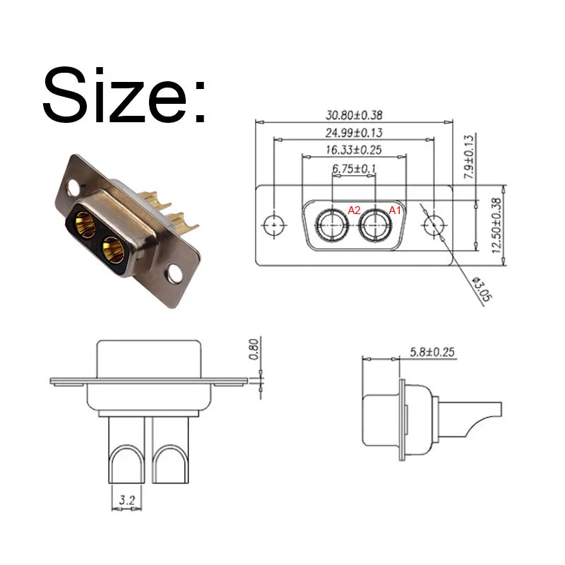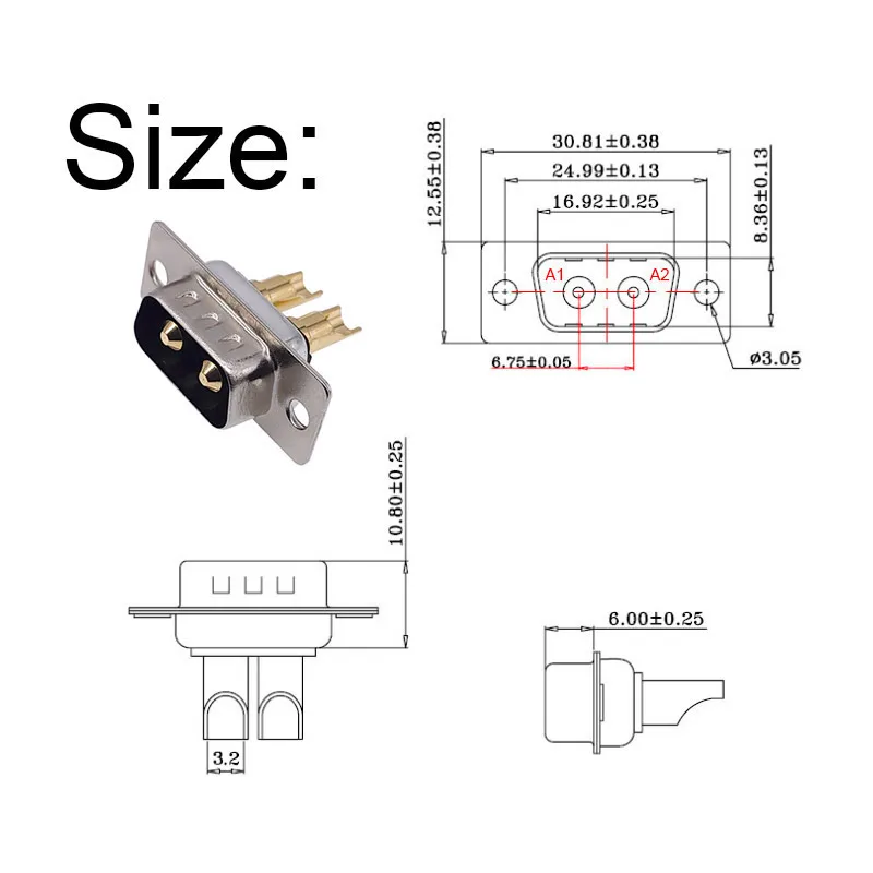 Conector macho y hembra chapado en oro, adaptador de D-SUB de alta corriente, tipo de soldadura, 2 pines, alta potencia, 1 pieza, 2W2, 2V2, 30A, 2 pines