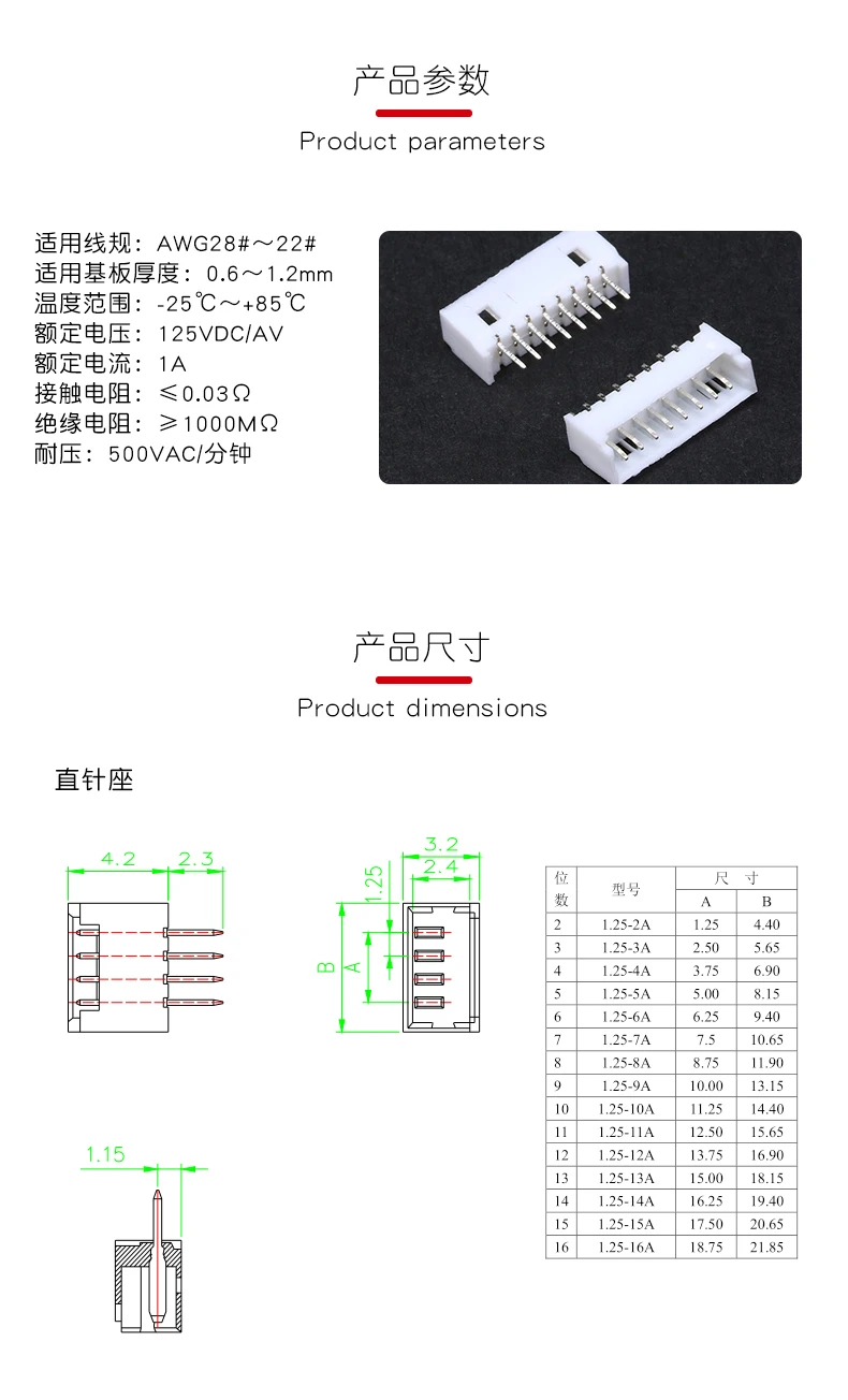 Comprar Conector Micor JST de 1000 MM, cabezal de Pin de Paso 2P/3P/4P/5P/6P/7P/8P/9P/10P, aguja recta para PCB, 1,25 piezas tablero 1,25
