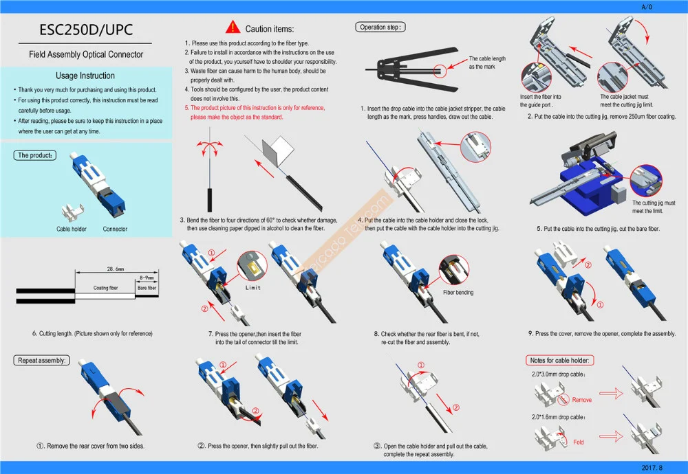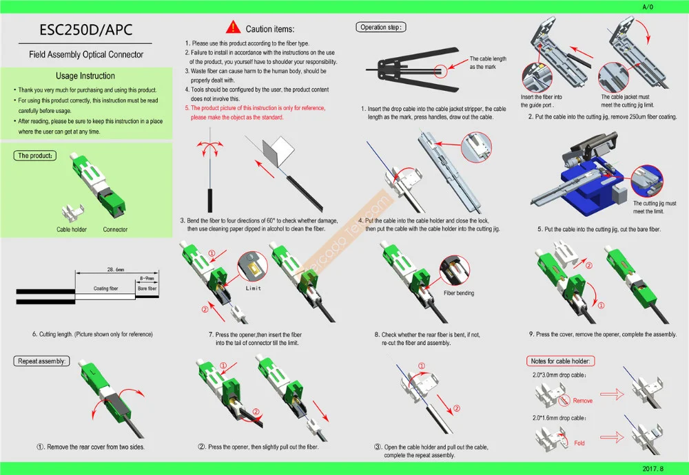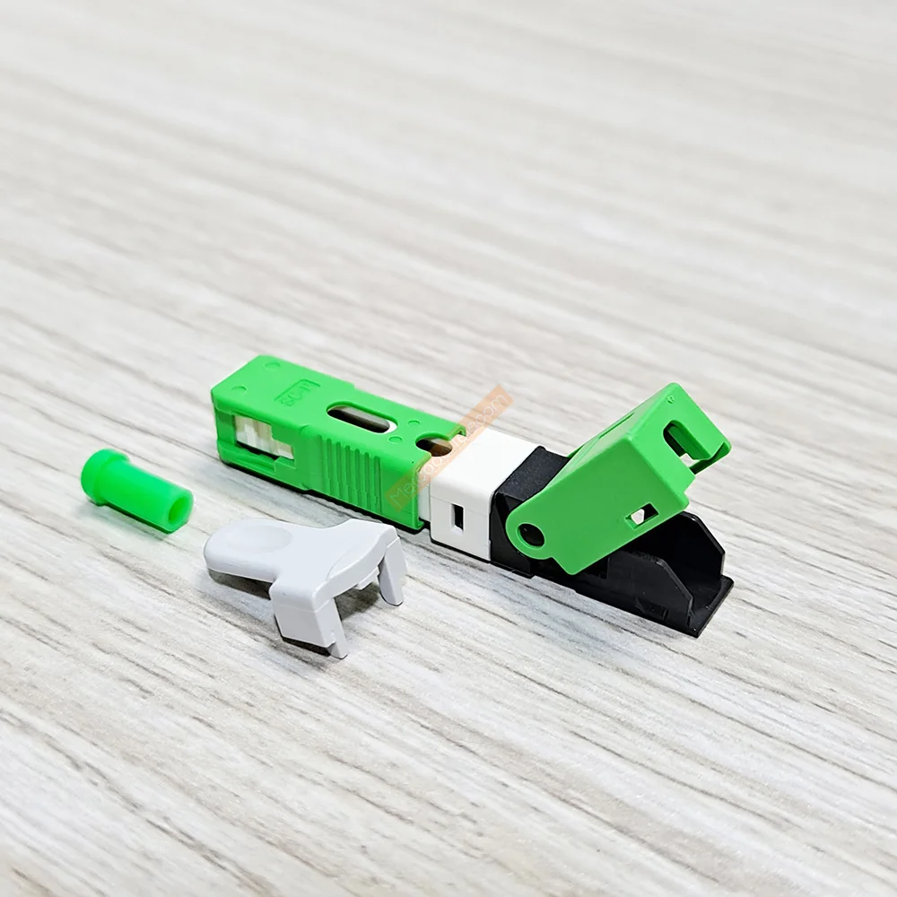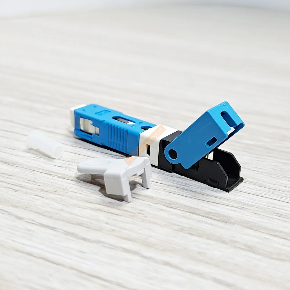 Montaje en campo S C/PC conector rápido para FTTH puede proporcionar una terminación rápida y fácil de fibras en el campo. Las opciones están disponibles para 900 micras, lo que permite al instalador terminar y hacer la conexión en minutos en el equipo y los paneles de conexión de fibra. Este sistema de conectores elimina cualquier requisito de epoxi, adhesivos u hornos de curado costosos y pulido e inspección de cara de fibra.