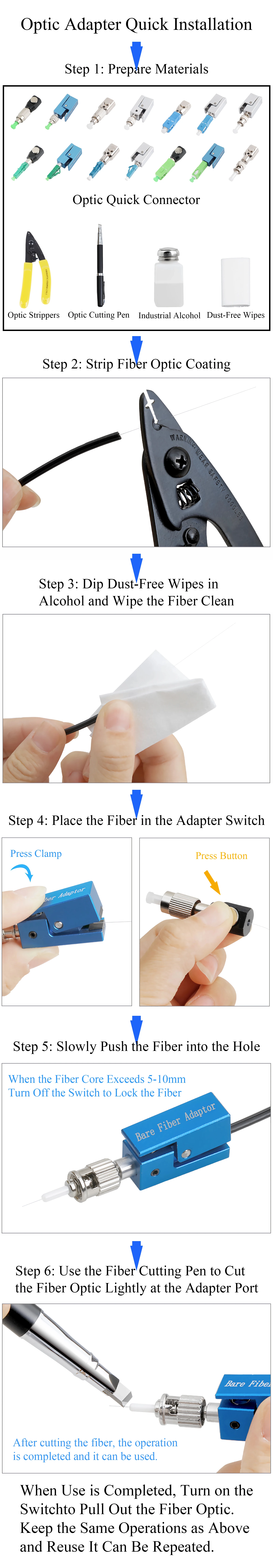 El adaptador de conexión rápida de fibra óptica es una herramienta auxiliar sencilla para pruebas de fibra óptica.No hay pegamento epoxi ni ningún medio en la virola ni en el orificio pasante de fibra óptica del adaptador de fibra desnuda.