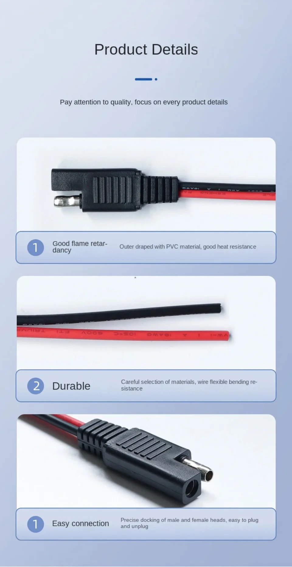 Descripción del producto:Nombre: cable de entrada/salida de cabezal único SAE.Los extremos del cable están pelados para facilitar la conexión y estañados.El cable de extensión de alimentación SAE es adecuado para automóviles, yates, motocicletas, conectores de paneles solares, tractores y otros equipos que requieren enchufe SAECable de cobre de alta calidad, garantiza la flexibilidad y versatilidad del cable de extensión SAE y proporciona una corriente estable para su equipoEl cable de extensión solar SAE es adecuado para la conexión y transferencia de células solares, transferencia de baterías de automóviles, etc.Cable de extensión solar SAE, buena conductividad, buena flexibilidad, muy grueso y duradero.