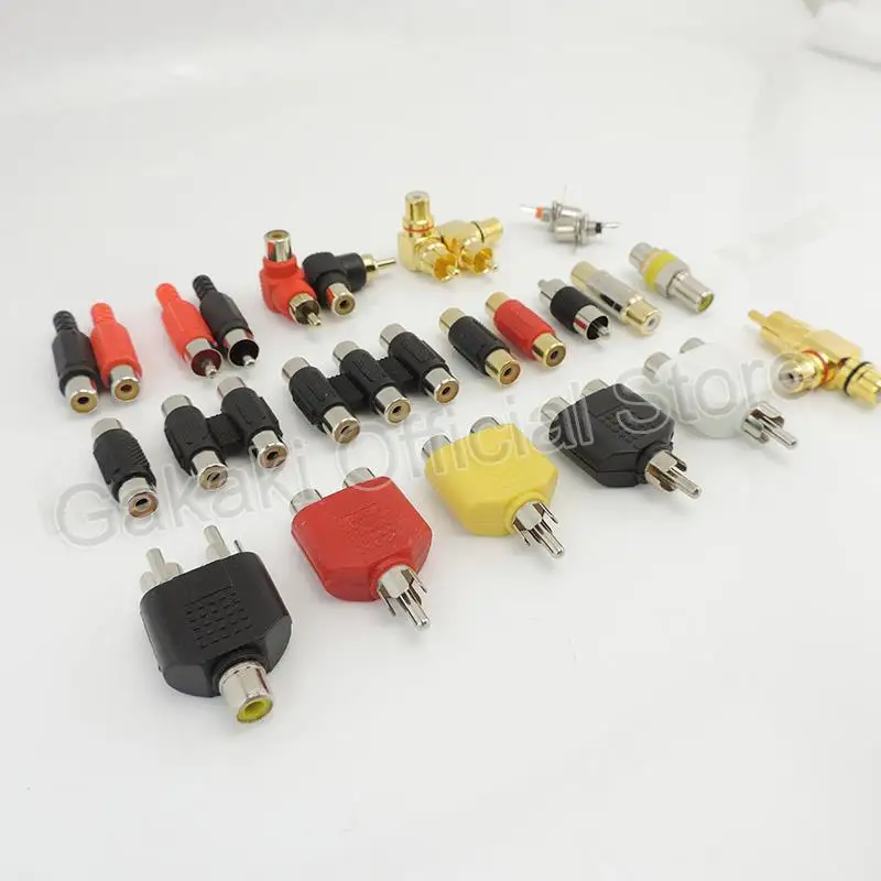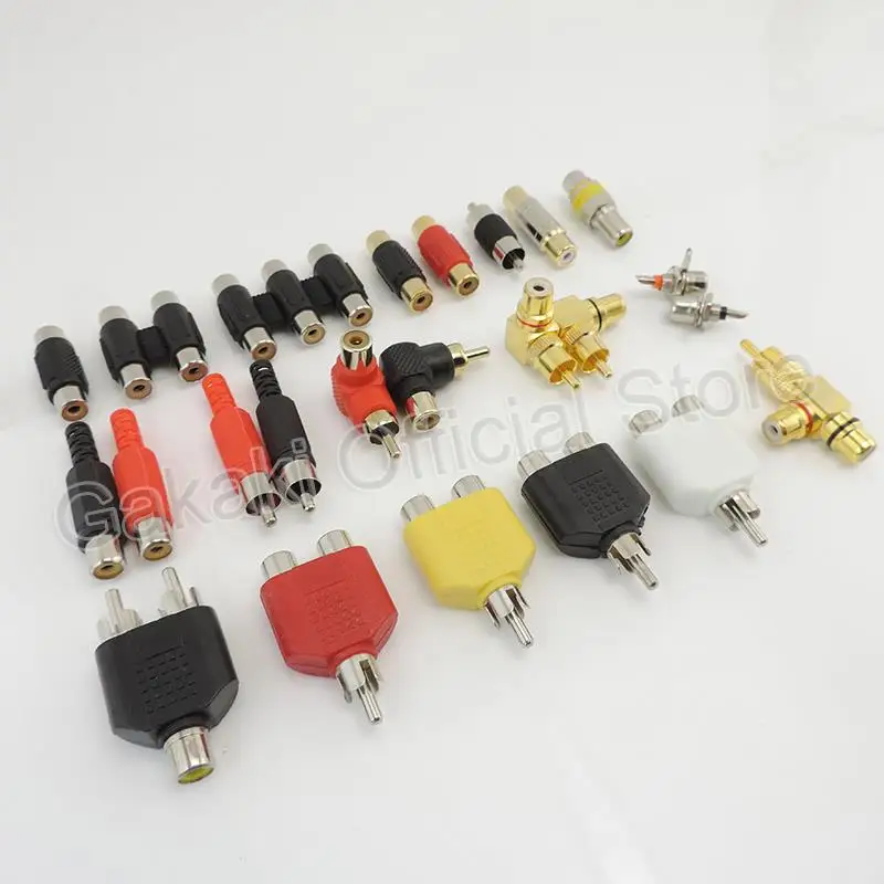 15).Enchufe macho RCA a conector RCA hembra doble en forma de T conector RCA de 3 vías chapado en oro