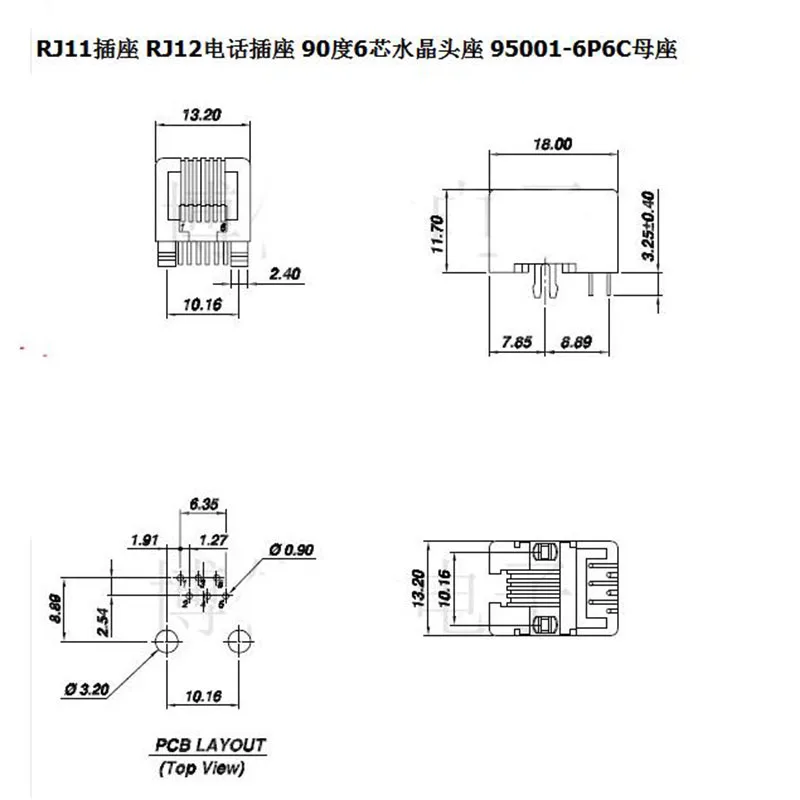 Toma RJ11 Toma de teléfono RJ12 Toma de cabeza de cristal de 90 grados y 6 núcleos 95001-6P6C Asiento hembra