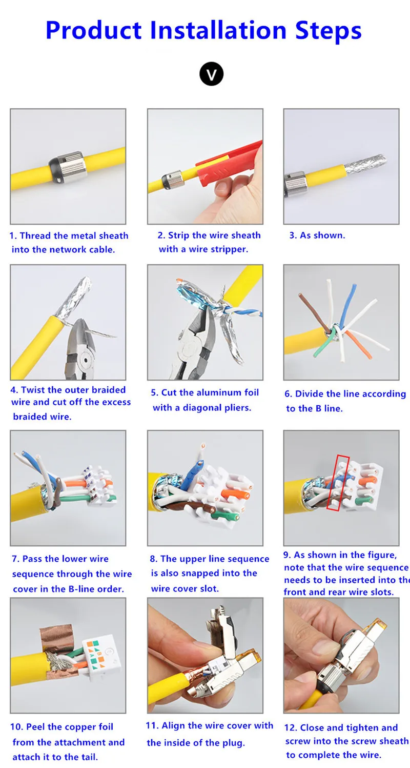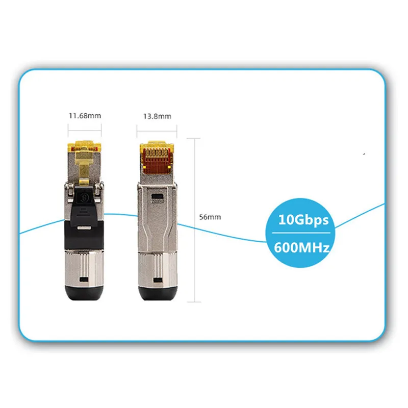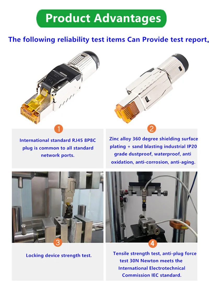 1. Nombre del producto:Conector rj45 de aleación de zinc DIY, enchufe Cat82.El material de la carcasa: fundición a presión de aleación de zinc con niquelado3.El material de contacto: Bronce fosforado con niquelado de 100 micropulgadas.422AWG-24AWG Cables trenzados y sólidos5.Tipo: Conector Ethernet Cat/8 con bota metálica