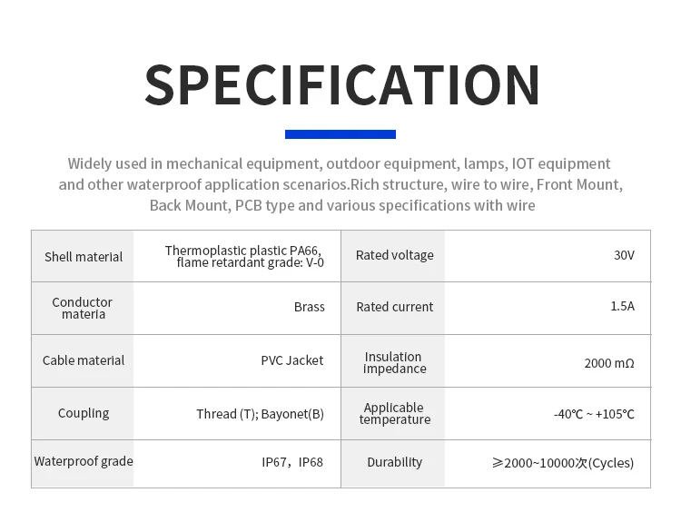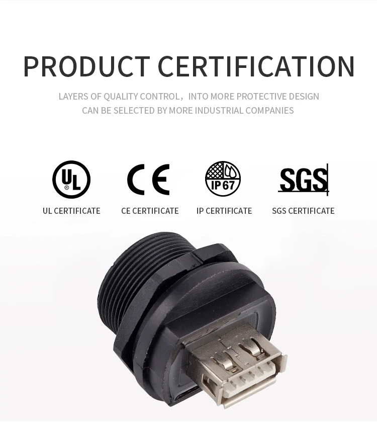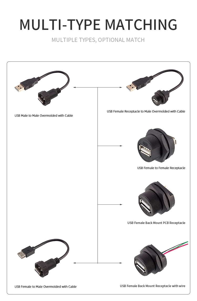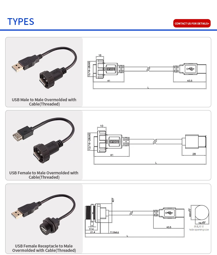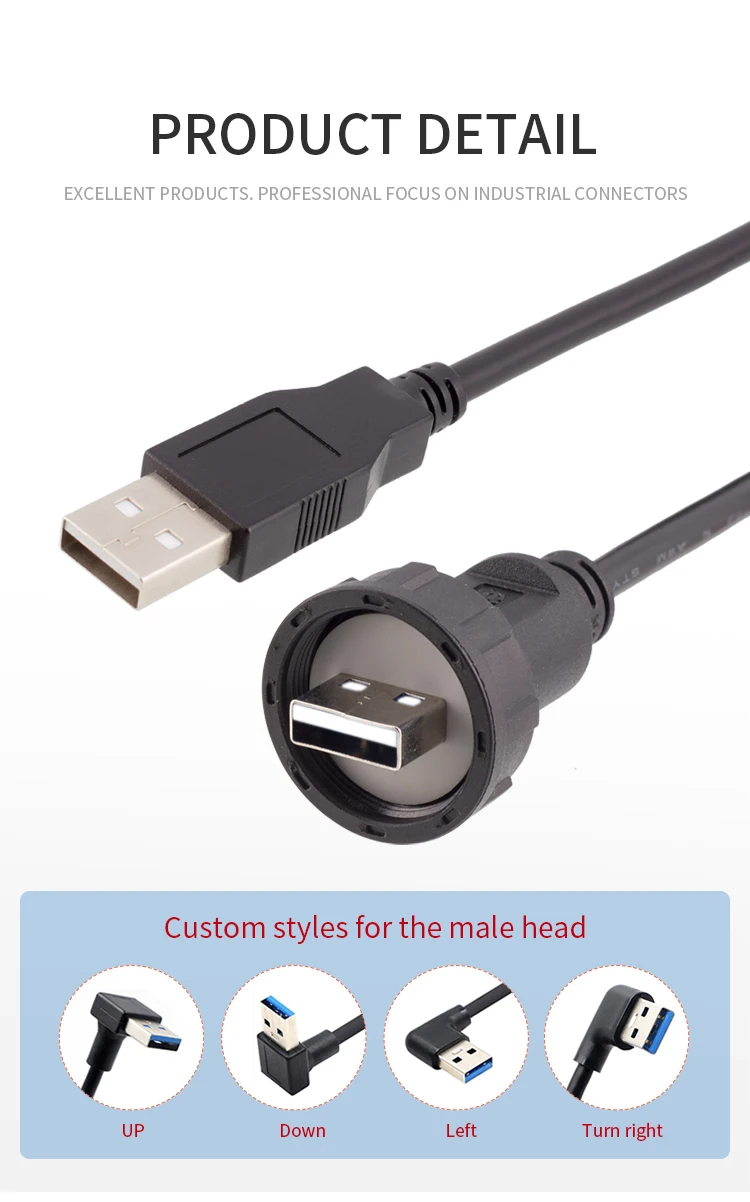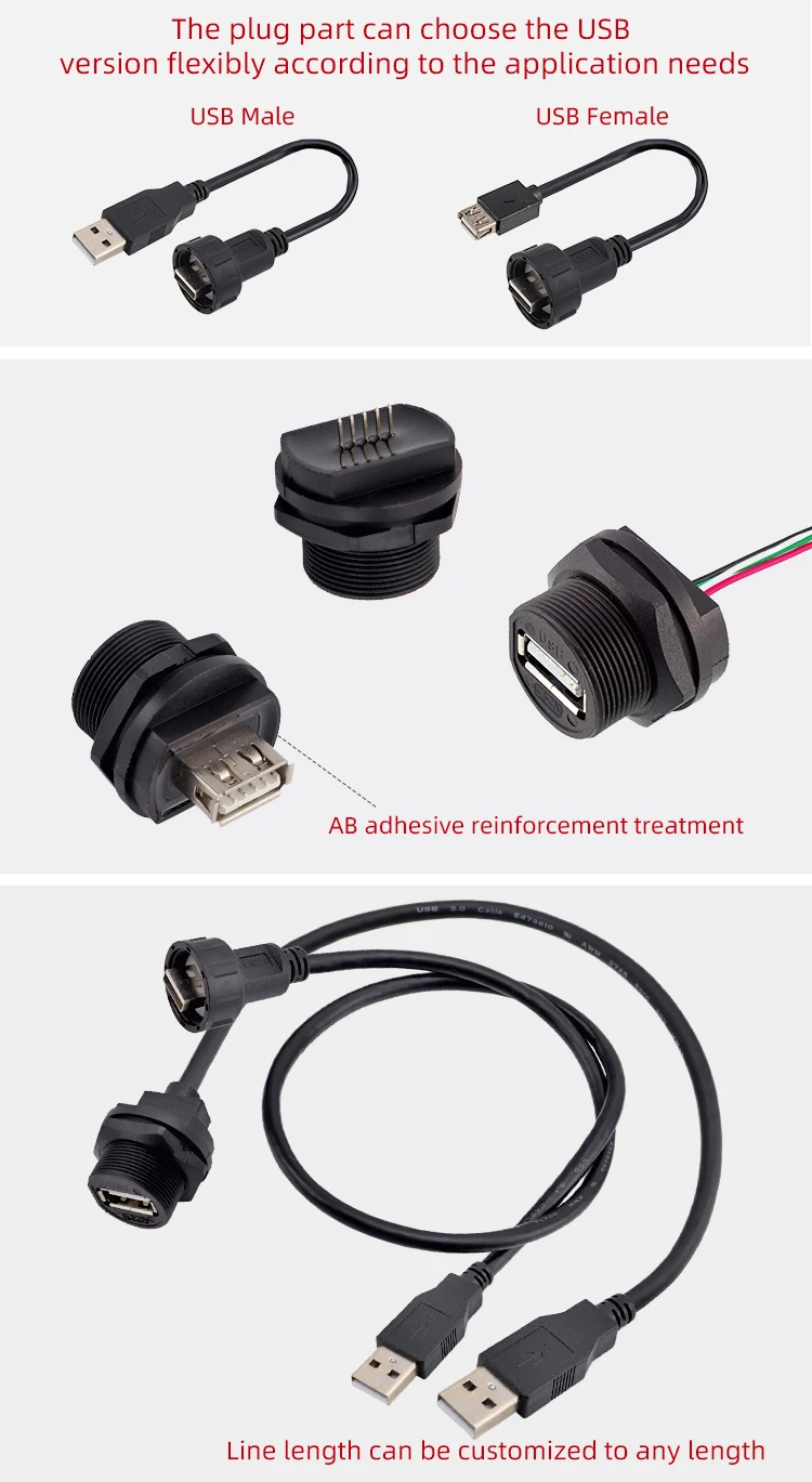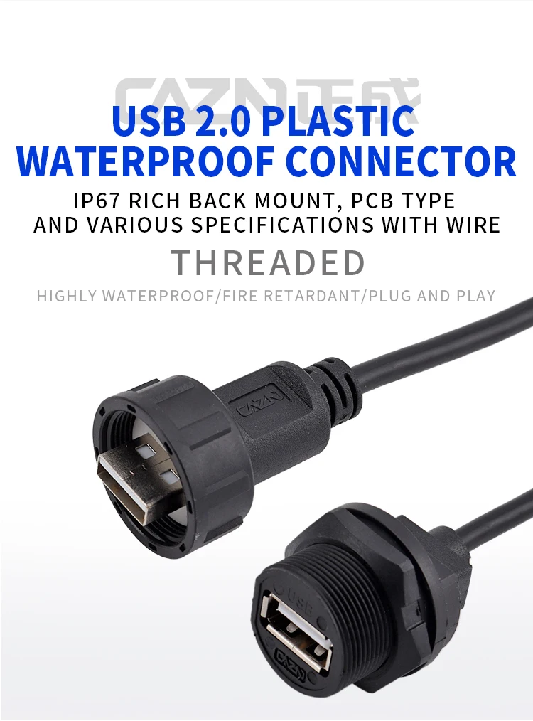 Enchufe USB2.0 roscado impermeable macho a macho/hembra 0,3 M, 0,5 M, 1 M, 2 M, 3 M, conector recto sobremoldeadoGrado impermeable: IP67/IP68