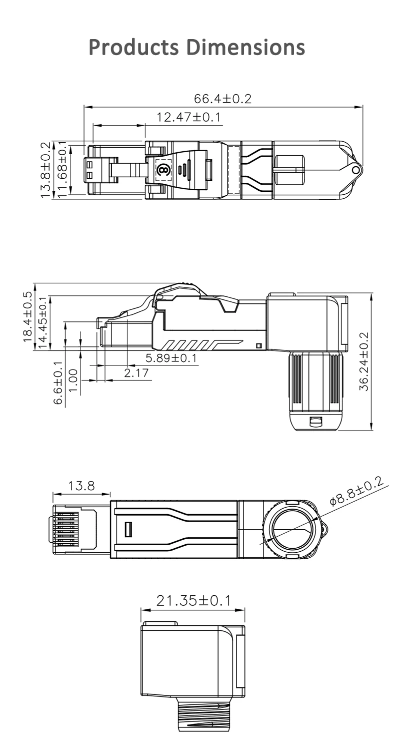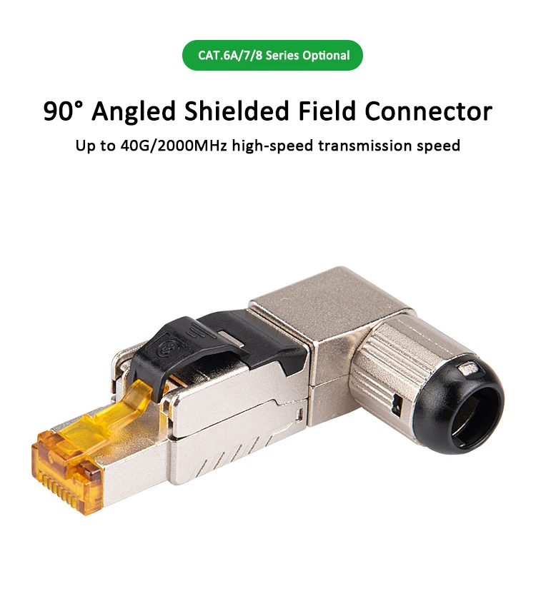 Comprar Conector de terminación de campo RJ45 de aleación de Zinc, completamente blindado, 90 grados, ángulo Cat.6A Cat7 CAT8 STP, tipo Toolless