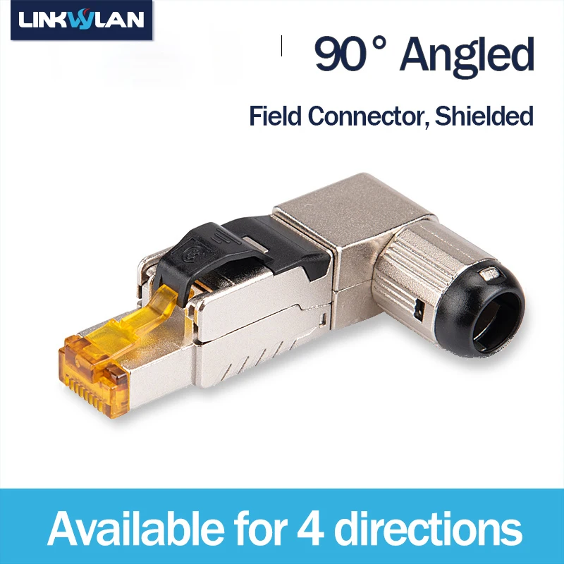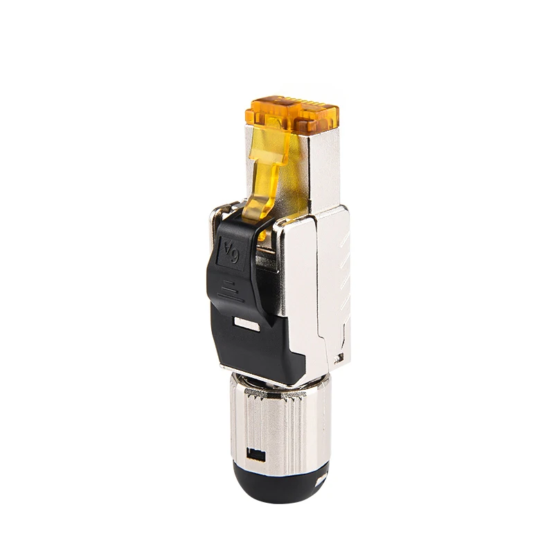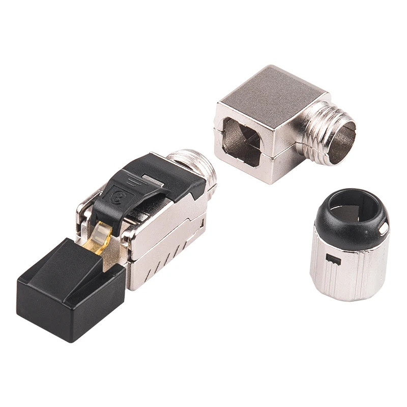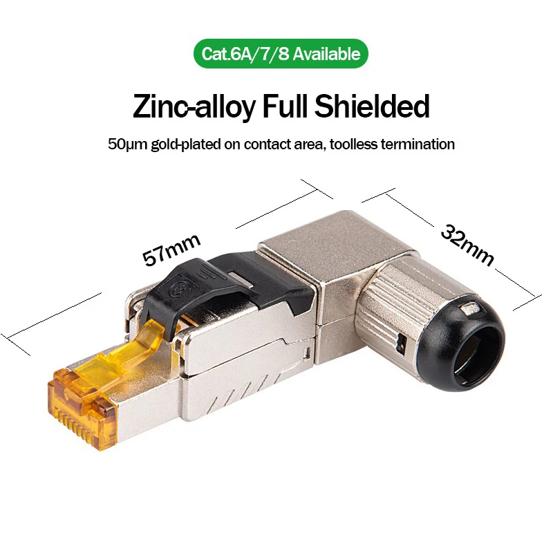 Comprar Conector de terminación de campo RJ45 de aleación de Zinc, completamente blindado, 90 grados, ángulo Cat.6A Cat7 CAT8 STP, tipo Toolless
