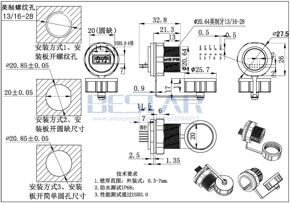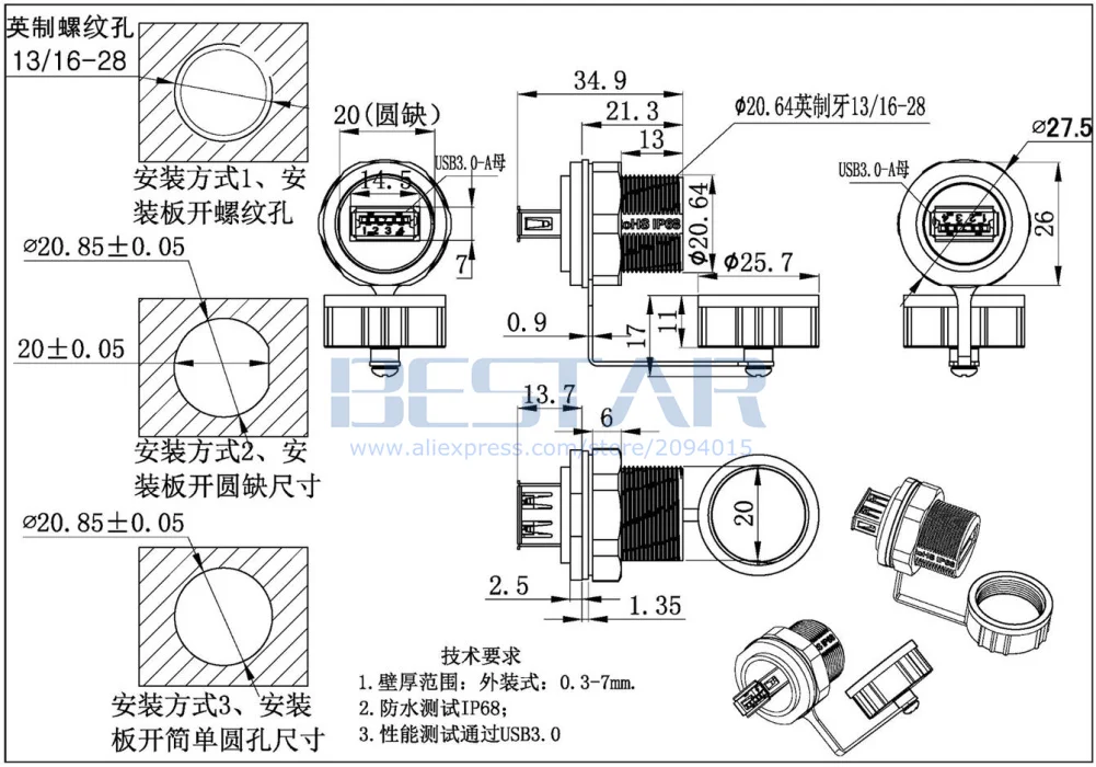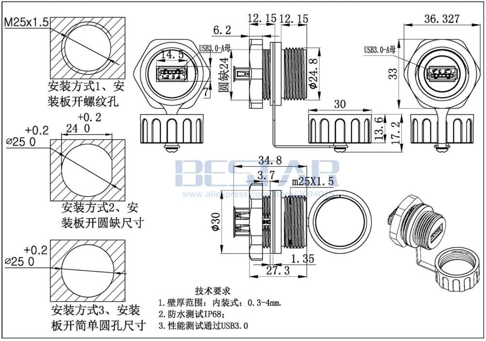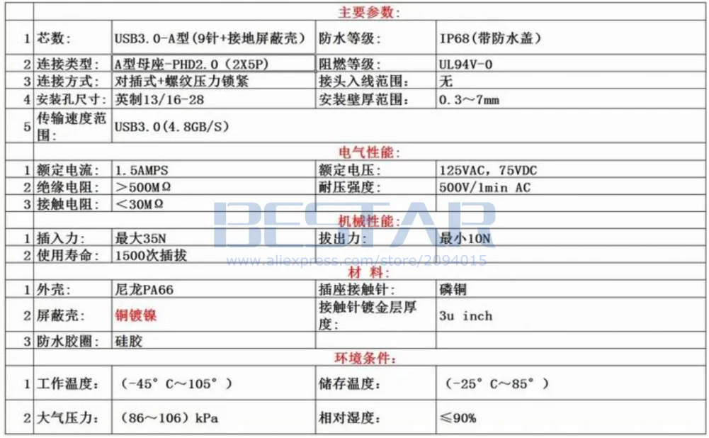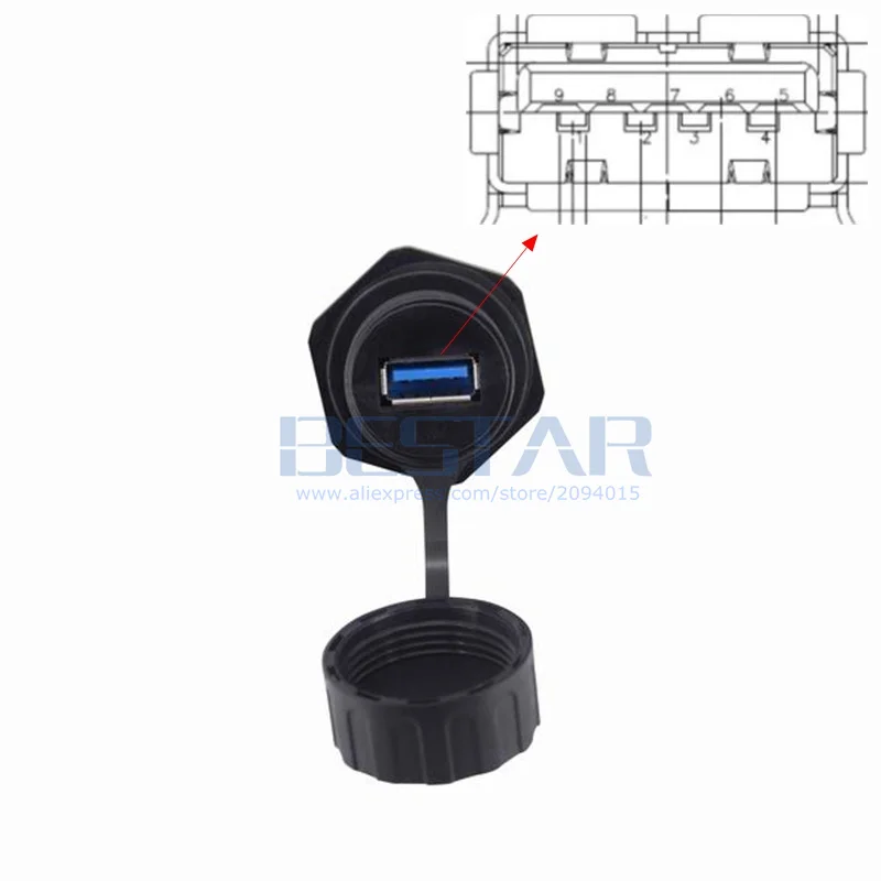 1. USB 3,0 tipo A hembra a hembra enchufe impermeable