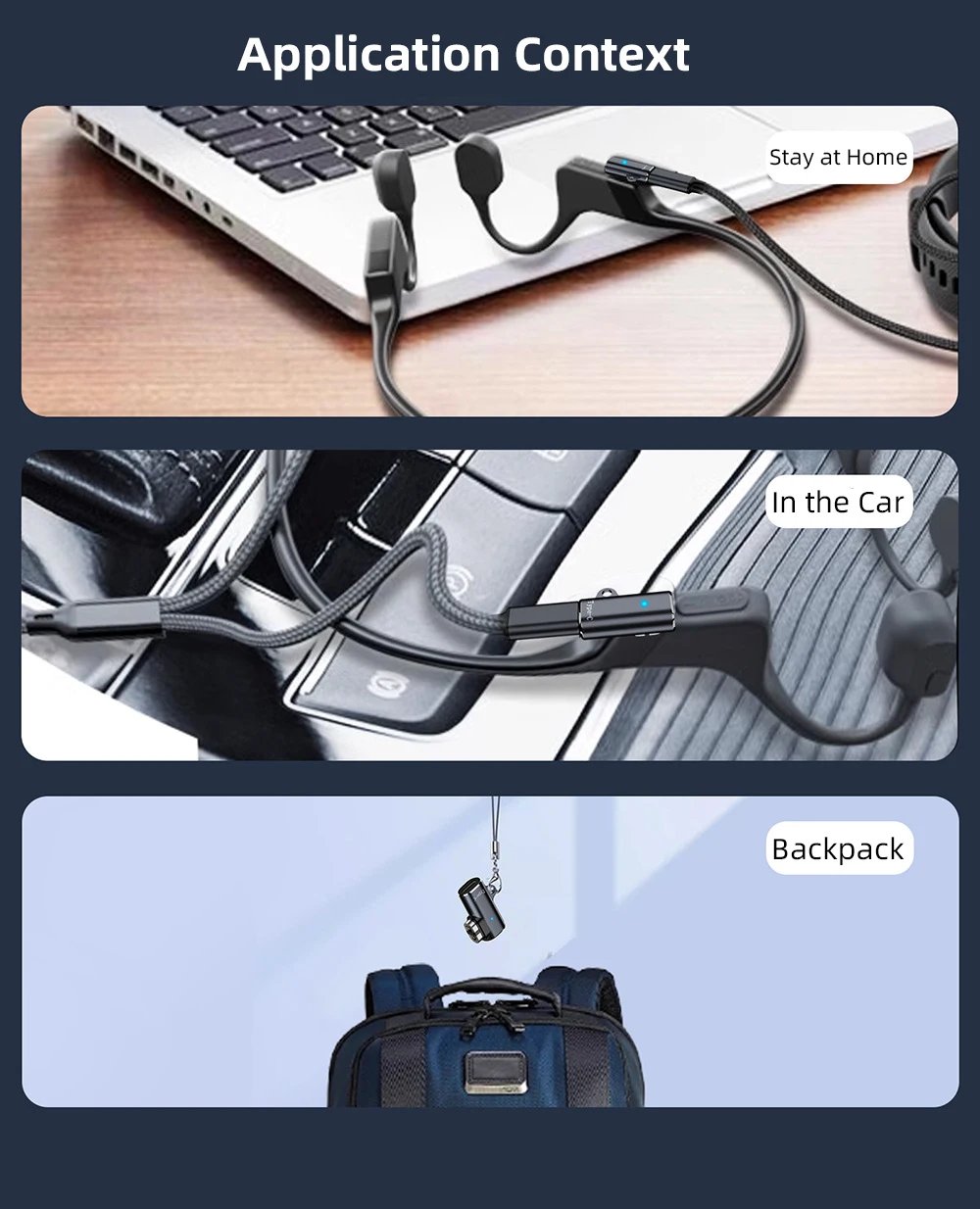 5.Facilidad de uso:Nuestro adaptador de cargador de auriculares de conducción ósea es compatible con cables de carga TYPE-C y iOS, lo que permite conectar una amplia gama de cables USB-C directamente a PC, portátiles o tomas de puerto USB para alimentación.Esta versatilidad simplifica el proceso de carga en diferentes escenarios, brindándole una experiencia de carga eficiente y estable.Nota: El producto no incluye cable de carga.