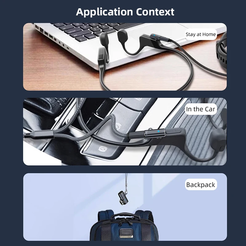 5.Facilidad de uso:Nuestro adaptador de cargador de auriculares de conducción ósea es compatible con cables de carga TYPE-C y iOS, lo que permite conectar una amplia gama de cables USB-C directamente a PC, portátiles o tomas de puerto USB para alimentación.Esta versatilidad simplifica el proceso de carga en diferentes escenarios, brindándole una experiencia de carga eficiente y estable.Nota: El producto no incluye cable de carga.