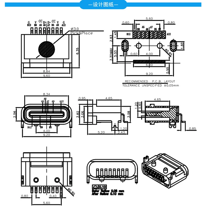 Conector USB de carga rápida, 10 piezas tipo c, 8 pines, conector horizontal de dos pines, columna de posicionamiento, IP67