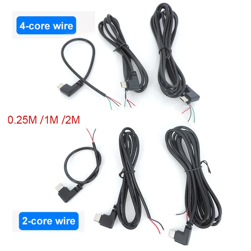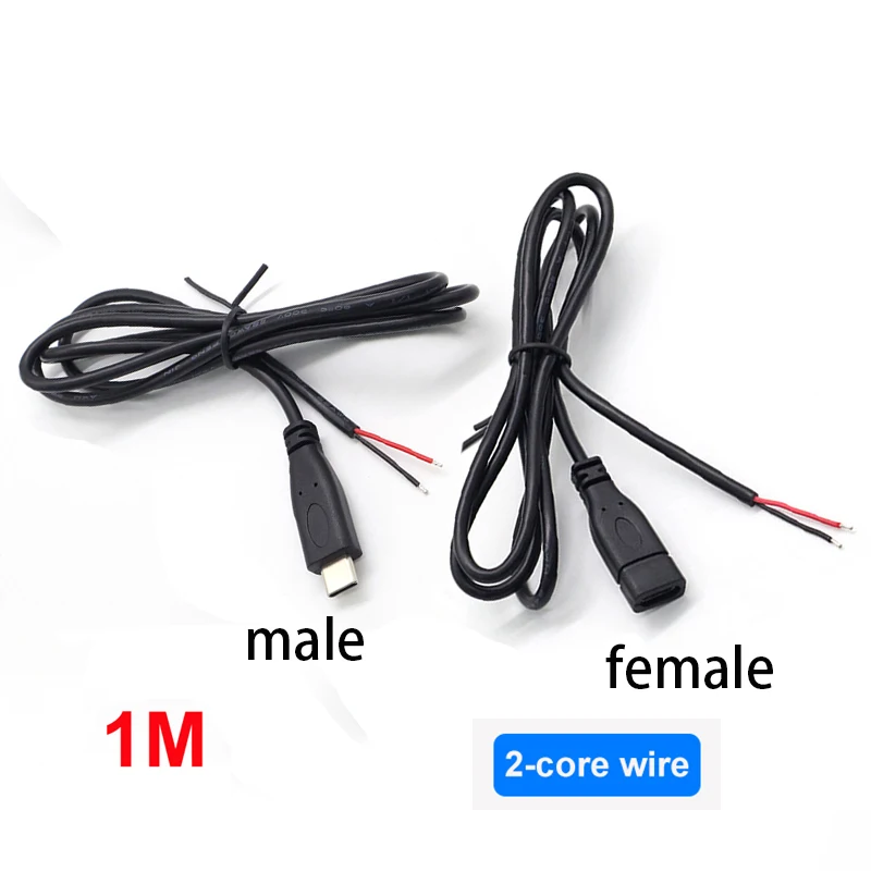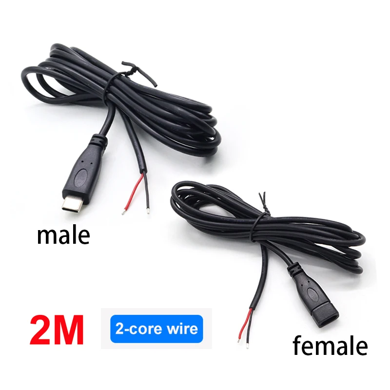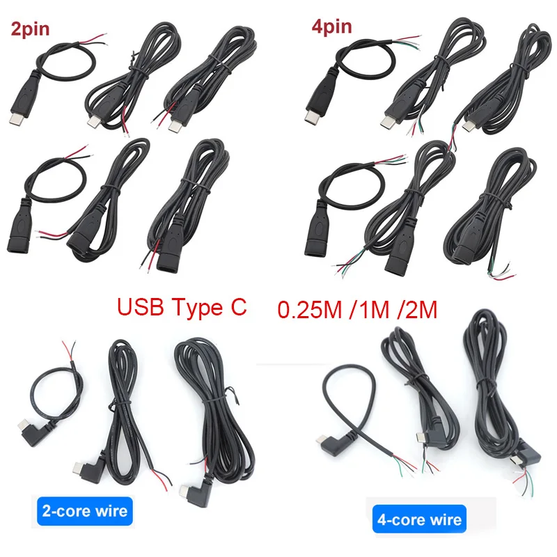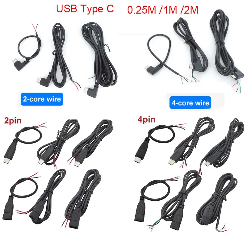Conector USB tipo C macho hembra, conector de cargador de fuente de alimentación, 2 pines, 4 pines, USB-C, Cable de reparación DIY, Cable tipo soldadura 0,25M, 1M, 2M