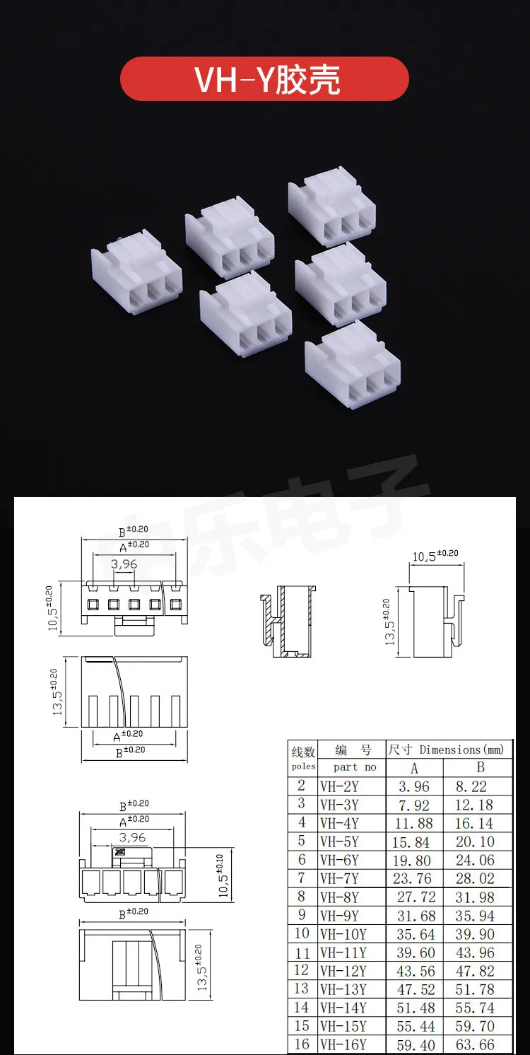 20 piezas conector VH paso de 3,96mm 2/3/4/5/6/7/8P carcasa de 2-8 pines