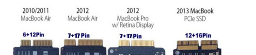2: 2012 version MacBook Air SSD is 7+17 pin, size is 109 mm*24 mm.2012 version MacBook Pro SSD is 7+17 pin, size is 89 mm*33 mm.It's SATA interface.