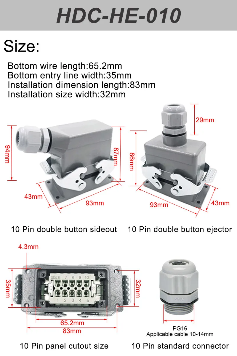 Comprar Conectores de alta resistencia HDC-HE-010-1/2/3/4 F/M 10pin 16A, conexión de tornillo, enchufe de conector rectangular Industrial