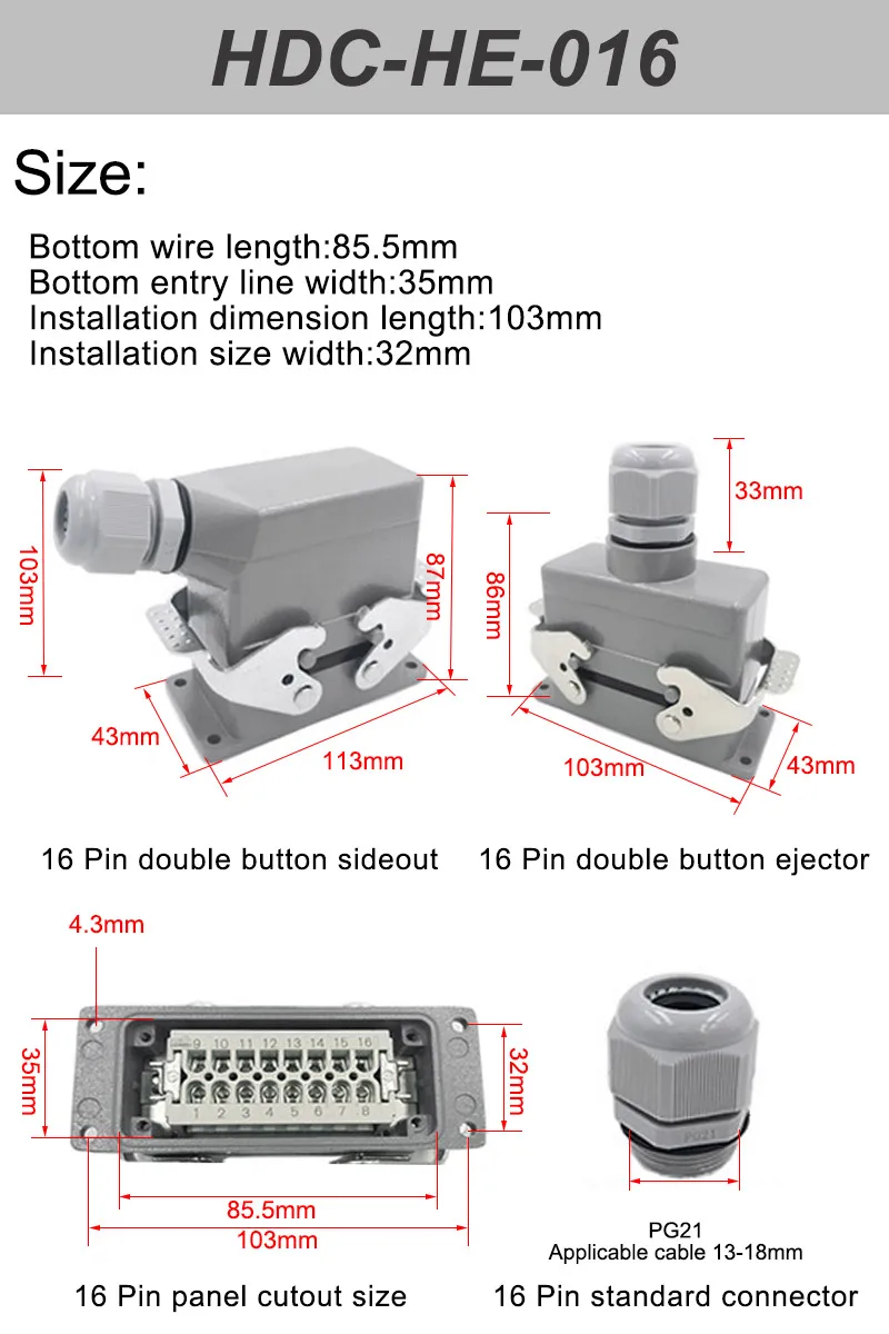Comprar Conectores de alta resistencia HDC-HE-016-1/2/3/4 F/M 16pin 16A 500V Conector rectangular industrial Conexión de tornillo