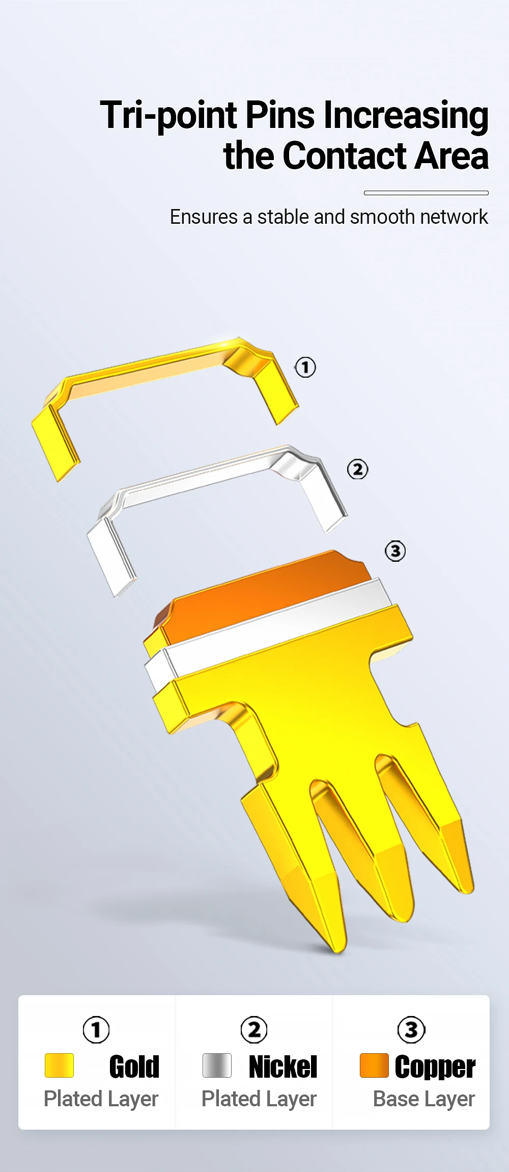 Alto rendimiento: los conectores pasantes chapados en oro de 3/50 μ con hoja de 3 clavijas garantizan una combinación más cercana entre los contactos y el núcleo del cable que la cuchilla de 2 clavijas y pueden proporcionar velocidades de transferencia de datos más altas.