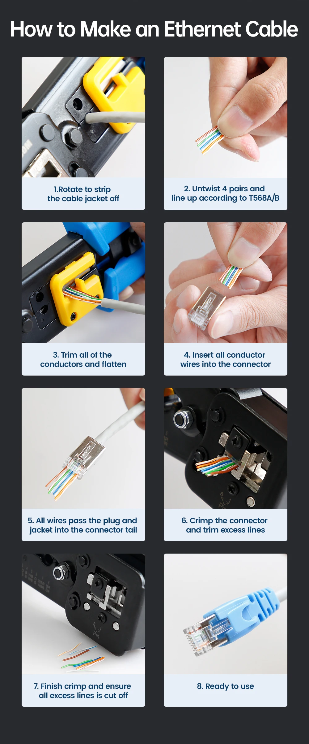 DISEÑO PASS-THRU: fácil de usar y con los conectores blindados puede identificar fácilmente el orden del cableado antes de engarzar, incluso si es la primera vez.Los cables pueden pasar a través de la ranura.