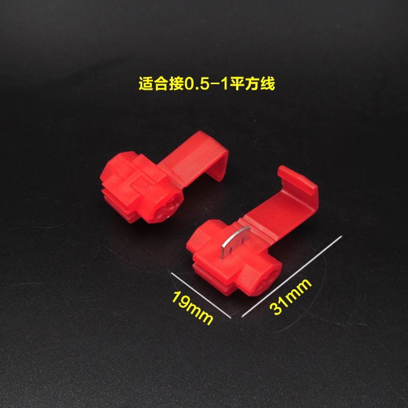 Paquete de conectores rojos de empalme rápido de línea media para cable 22-10 AWG. Los empalmes rápidos son una forma rápida y fácil de empalmar en un cable existente. No es necesario pelar los cables. Simplemente inserte ambos cables en el empalme, doble la parte superior con el inserto de metal sobre los cables y Apriete hacia abajo con alicates hasta que la tapa encaje en su lugar. El inserto de metal en el conector está diseñado para cortar el aislamiento y hacer la conexión entre los dos cables.Colores: rojo/azul/amarilloCorriente máxima: 10A /15A /24ATamaño del conector: cable 22-16AWG/ 16-14AWG /12-10 AWG