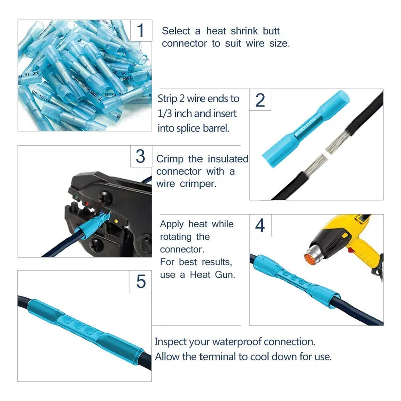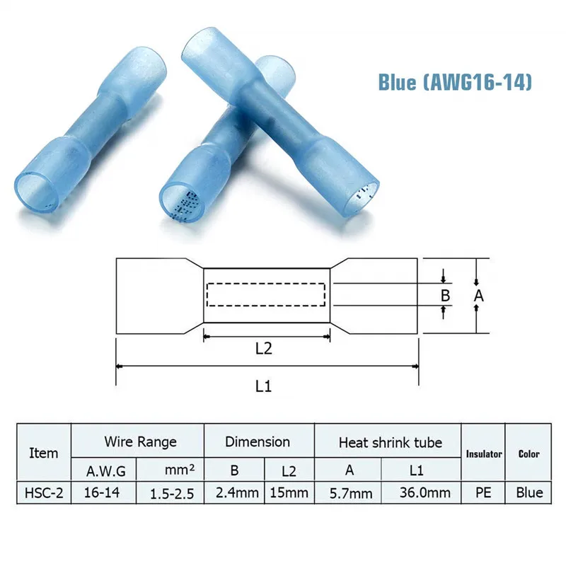 Tamaños: Conectores a tope azul: diámetro 4,5mm, sección transversal del cable 1,5-2,5mm ⊃ 2; (A.W.G.:16-14); Características: ✔Relación de contracción: 3:1 ✔Tubo de diseño de doble pared: Tubo de poliolefina en el exterior y adhesivo termofusible en el interior. ✔El adhesivo termofusible proporciona una excelente propiedad impermeable ✔Sin daños en el cable debido a la menor temperatura de contracción ✔Impresión de calibre de alambre en conectores ✔Ideal translúcido proporciona resistencia a la tracción, permite la inspección visual. Rango de temperatura de funcionamiento: ● Temperatura de funcionamiento: -55 °C a 125 °C ● Temperatura mínima de contracción: 80 ℃ ● Temperatura de recuperación total: 130 °C Cómo usarlo: Seleccione un conector termorretráctil que se adapte al tamaño. Tira de aislamiento a 8mm e insértelo en el barril de empalme. Engarzado usando la herramienta para conectores aislados. Aplique calor mientras gira el conector. Para obtener mejores resultados, use una pistola de calor o un mini soplete. Inspeccione su conexión de calidad impermeable.